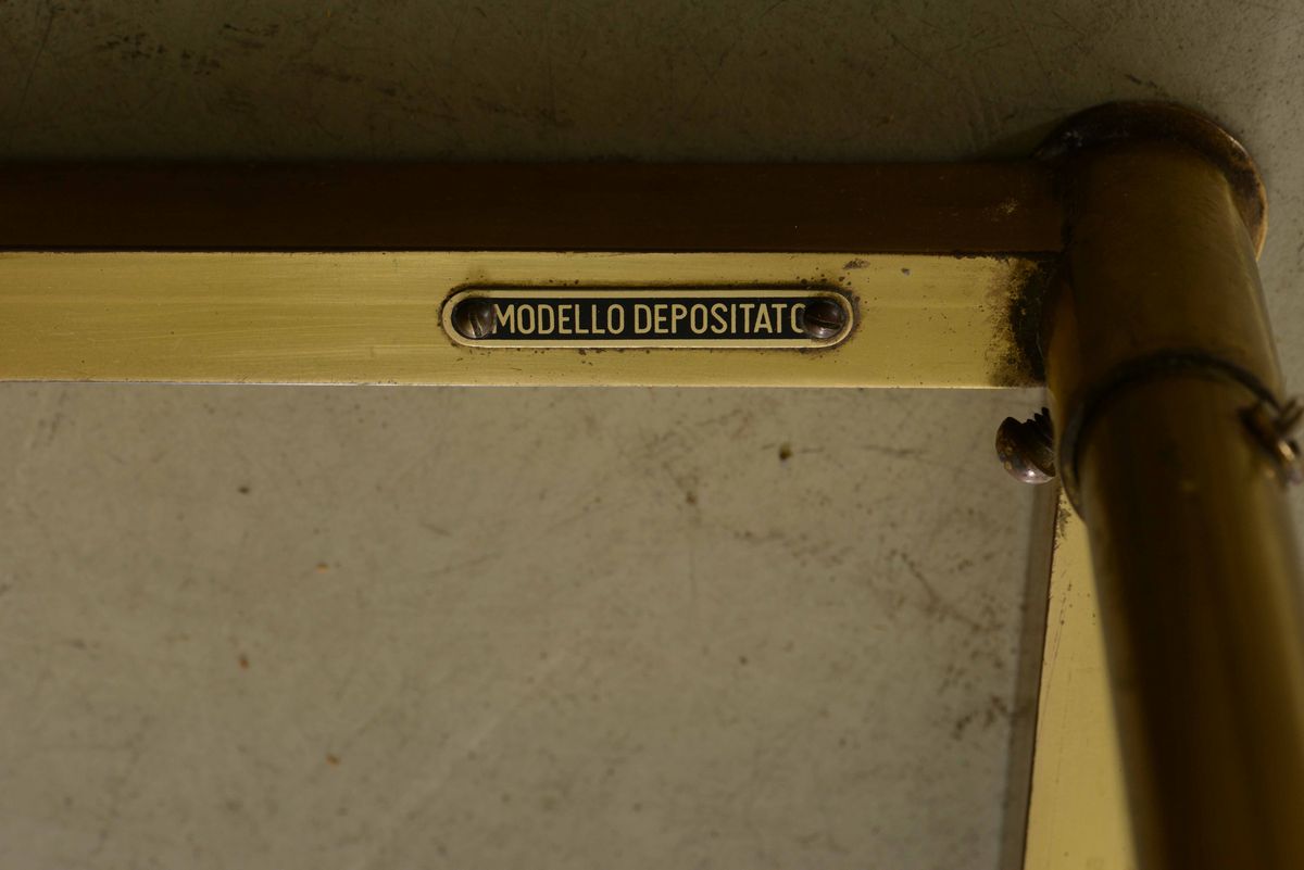 Toiletta luminosa con struttura e sostegni in ottone, piani in vetro acidato, sagomato e molato, specchio basculante.