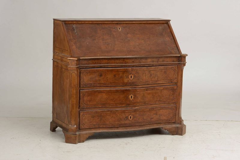 Cassettone a ribalta in noce e radica di noce con intarsi a profilature. Napoli, metà XVIII secolo