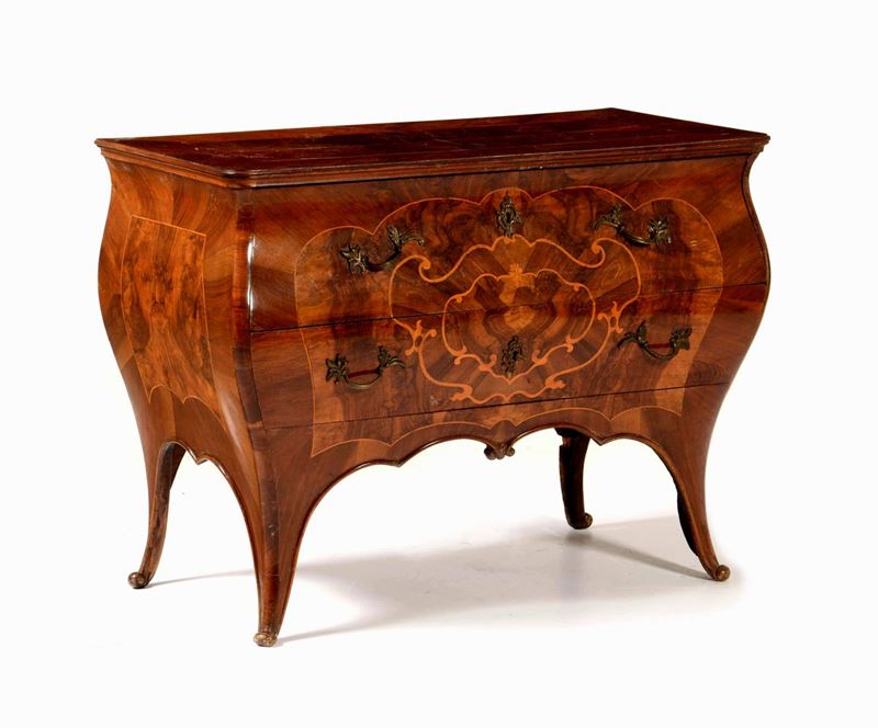 Coppia di cassettoni in vari legni con intarsi floreali. Italia settentrionale, XIX-XX secolo