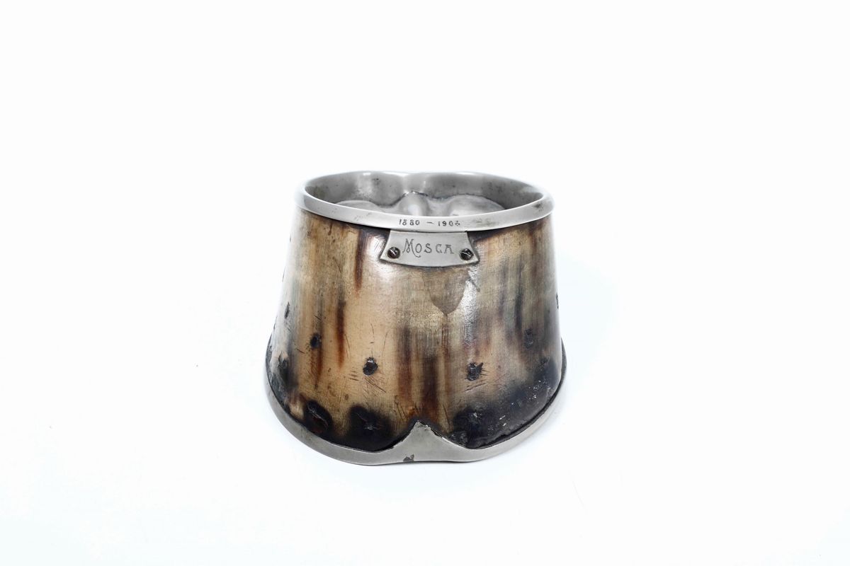 Zoccolo di cavallo (posacenere) con finitura in metallo. Incisione “Mosca 1880/1904”