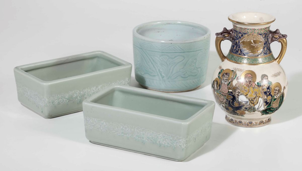 Porcellana. Marca: non visibile. Altezza totale cm 28,5. Conservazione: un vaso in perfetto stato; l’altro con mancanza al manico. Montati su base in pietra nera