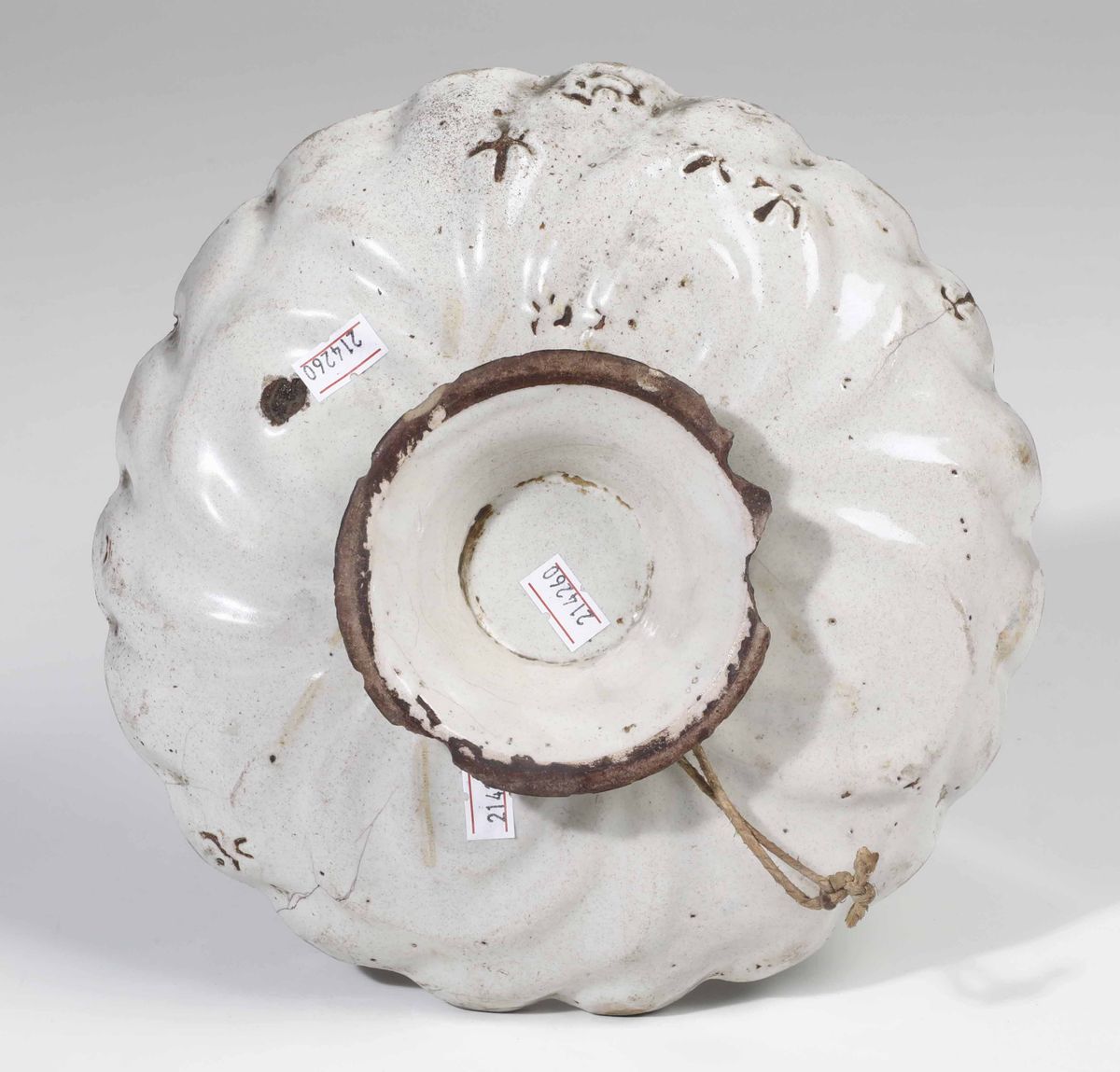 Maiolica policroma a gran fuoco. Dimensioni: altezza cm 6 ca; diametro cm 24. Conservazione: sbeccature al piede; qualche felatura
