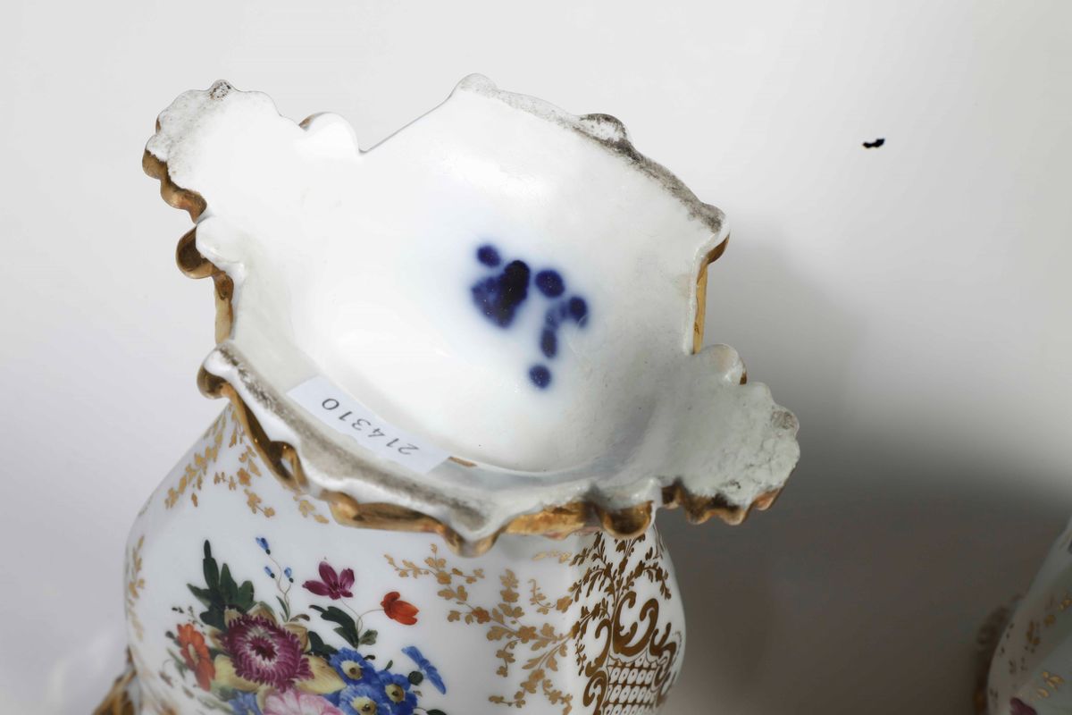Porcellana policroma e oro. Marca: J. P. in blu. Dimensioni: altezza cm 17,5 e rispettivamente cm 15,3. Conservazione: perfetto stato esclusa qualche piccola usura all'oro; un vaso con rottura al bordo superiore rincollata e sbeccatura ad un piedino