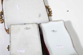 Porcellana. Marca: “Limoges Francia in verde”. Dimensioni: altezza cm 4,3 x 20 x 16,3; altezza cm 5 x 14 x 10; altezza cm 6,6 x 13 x 10. Conservazione: una scatola con felature a stella sul lato posteriore