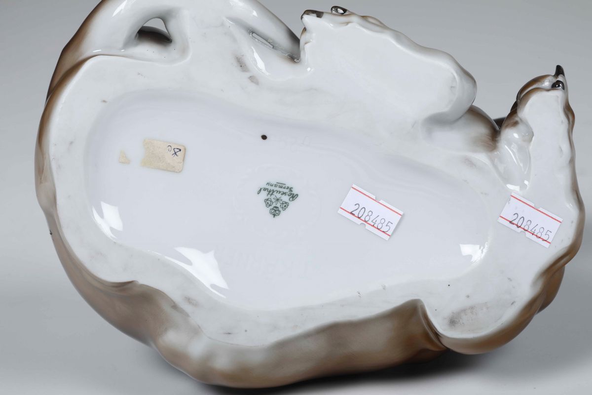 Porcellana policroma. Marca: due rose incrociate con corona e “Rosenthal Germany” in verde; “T. Kärner” impresso. Dimensioni: h. cm 14,3x20,5x14,2. Ottimo stato di conservazione