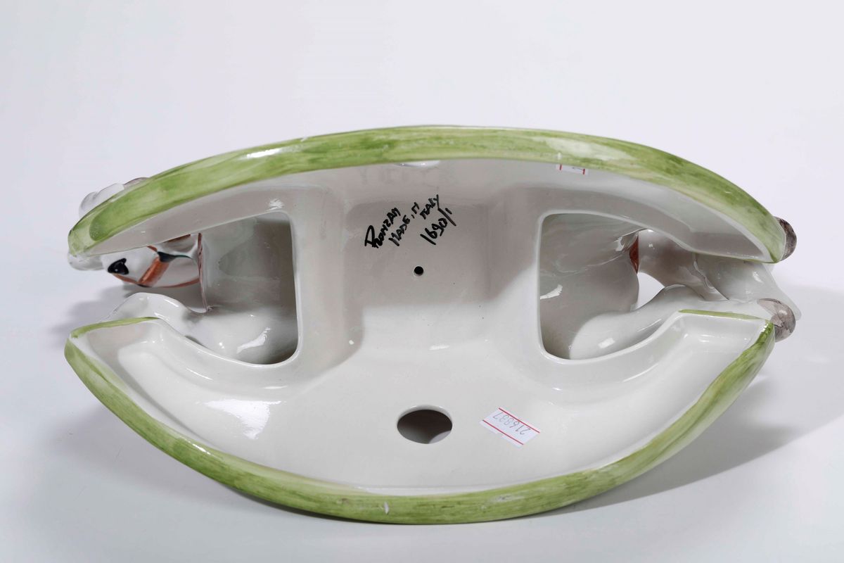 Terraglia policroma. Marca: Ronzan, made in Italy, 1690/1 in nero. Altezza cm 24,5 x 30 x 14. Conservazione perfetta