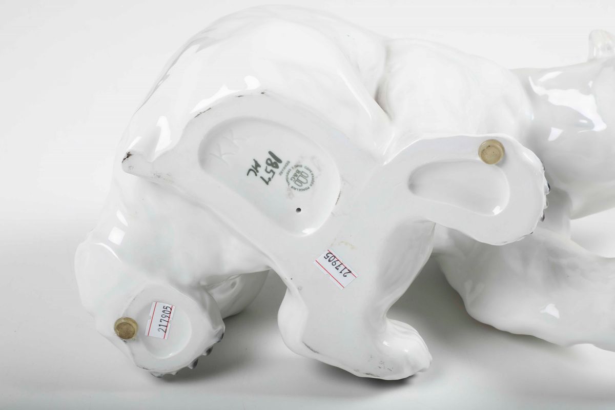 Porcellana policroma. Marca: tre orsi B&G Copenhagen Porcelain Bing & Grøndahl Denmark e numeri diversi in verde; un orso, onde in blu Royal Copenhagen Denmark con corona in verde. Dimensioni: il pezzo più grande altezza cm 21 x 35 x 20; il più piccolo altezza cm 8 x 16,5 x 8. Conservazione perfetta