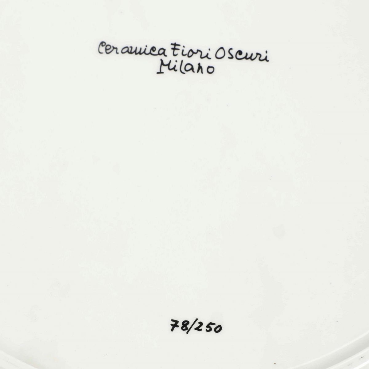 Porcellana. Marca: Ceramica Fiori Oscuri Milano e numeri diversi in nero. Dimensioni: diametro cm 30,5. Conservazione: ottima