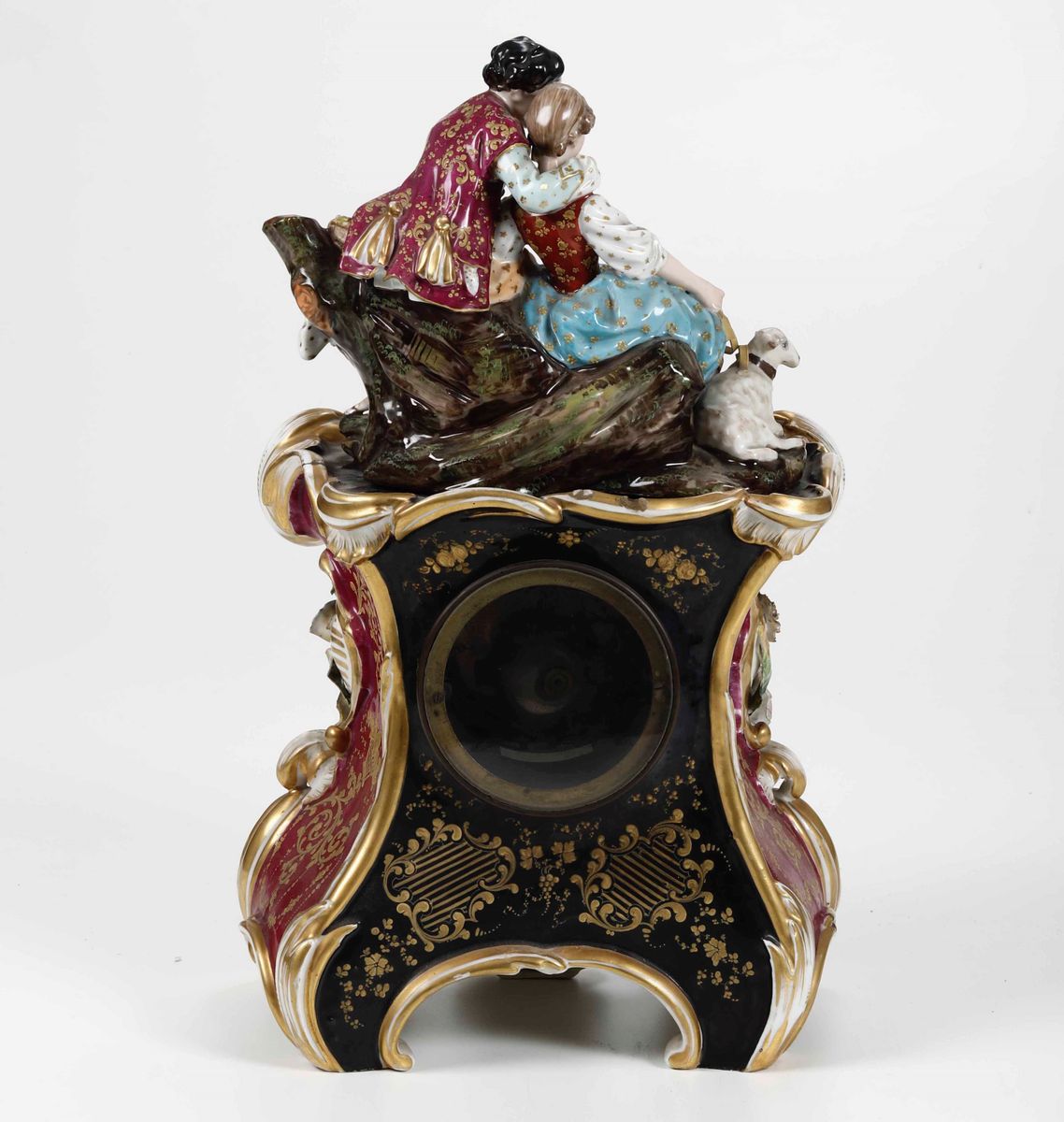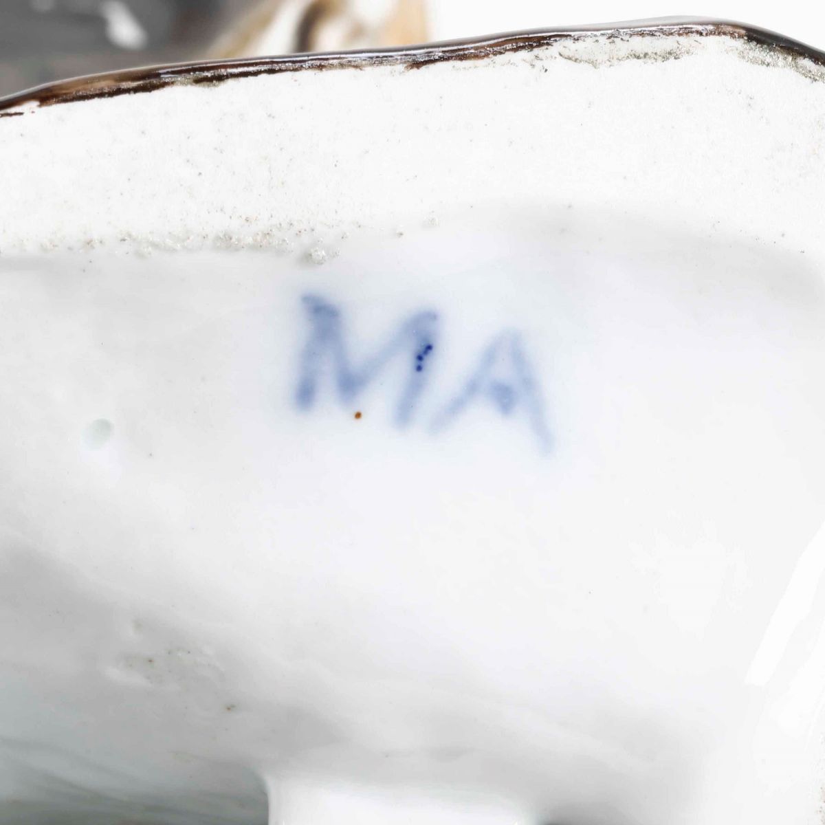 Porcellana. Marca: MA in blu sotto il gruppo. Altezza: cm 42,5. Conservazione: alcune sbeccature ai fiori; sbeccatura alla rocaille superiore della base; cane rotto in due e incollato; piede della giovane riparato; altre sbeccture minori.