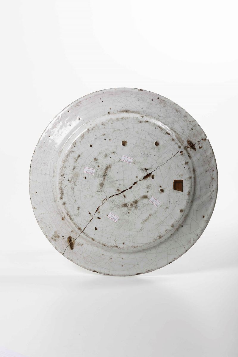 Maiolica. Marca:assente. Dimensioni:diametro 38,5. Conservazione: rotto in due frammenti e rincollato; presenza di due agrafes