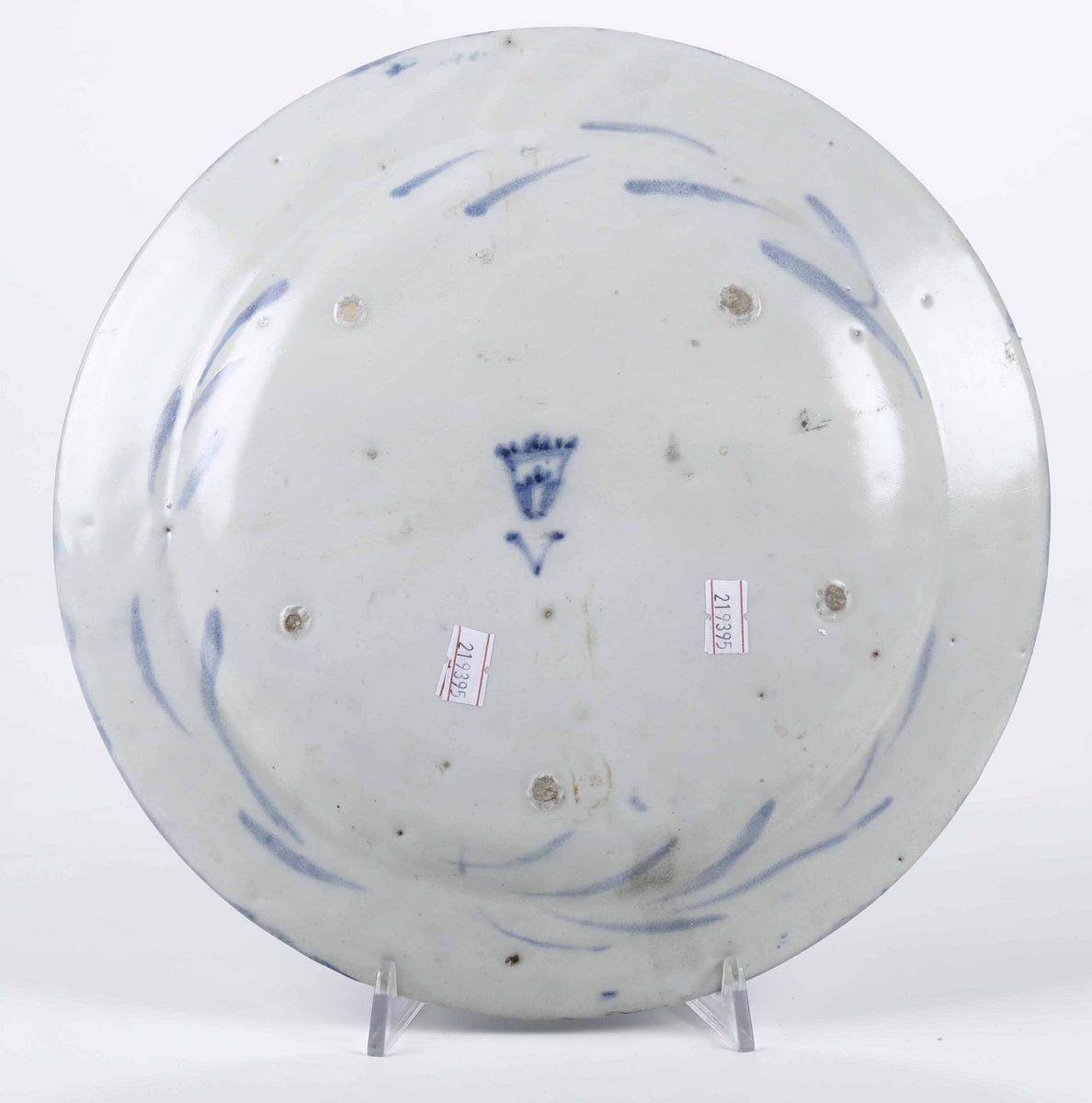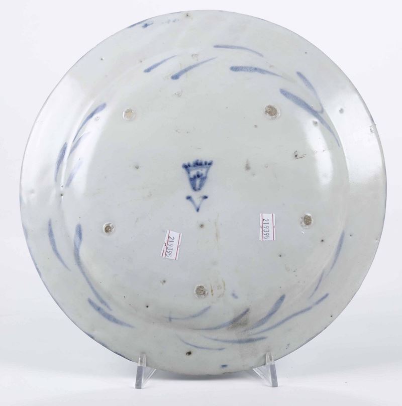 Maiolica a gran fuoco in monocromia blu di cobalto. Marca: stemma di Savona e lettera V in blu. Dimensione: diamentro: cm 29,5 circa. Conservazione: probabilmente rotto in due o più frammenti e ricomposto in restauro