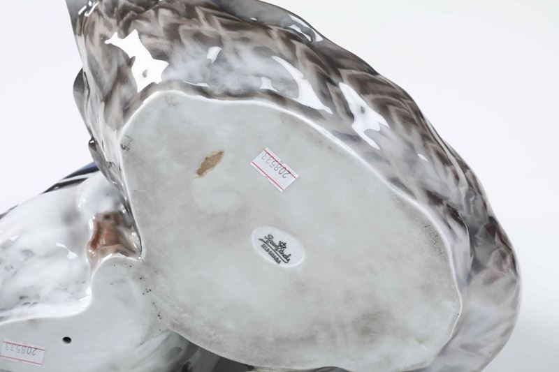 Porcellana policroma. Marca: “Rosenthal” coronata tra due bastoni incrociati e “Selb-Bavaria” in verde. Dimensioni: h. cm 32,5; 26,3x28,7. Una zampa rincollata