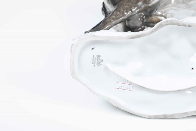 Porcellana policroma. Marca: “Rosenthal” coronata tra due bastoni incrociati e “Germany Kunstabteilung Selb”, in verde grigio. Dimensioni: h. cm 39,5x41x26. Un corno con restauri
