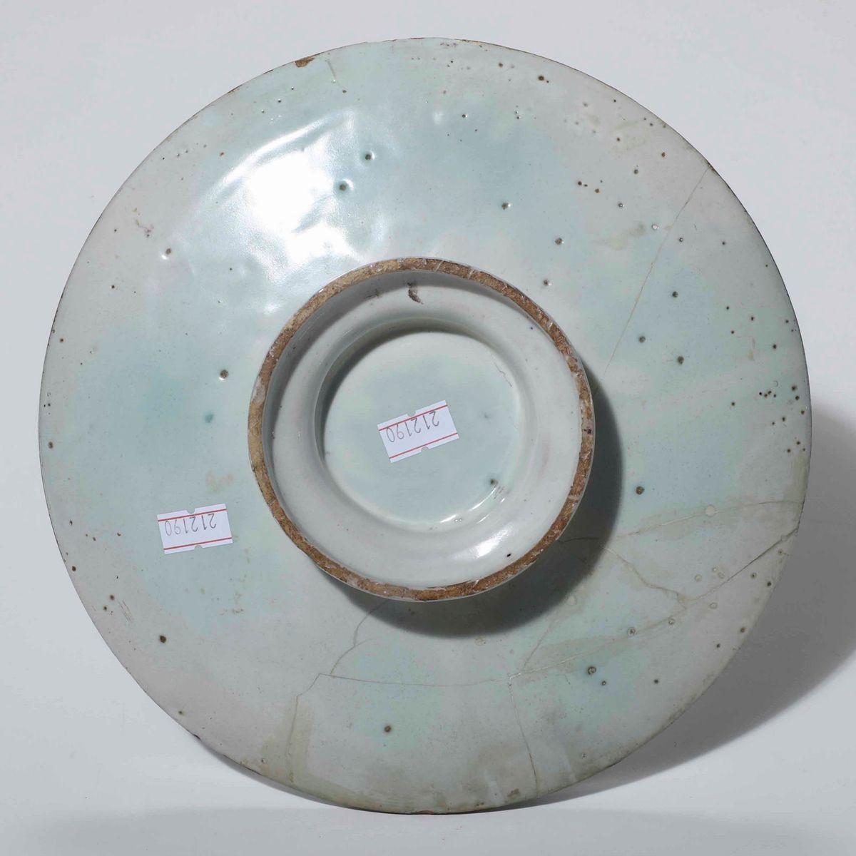 Maiolica. Marca: assente. Altezza cm 5 circa; diametro cm 23. Rotta in più frammenti e ricomposta in restauro