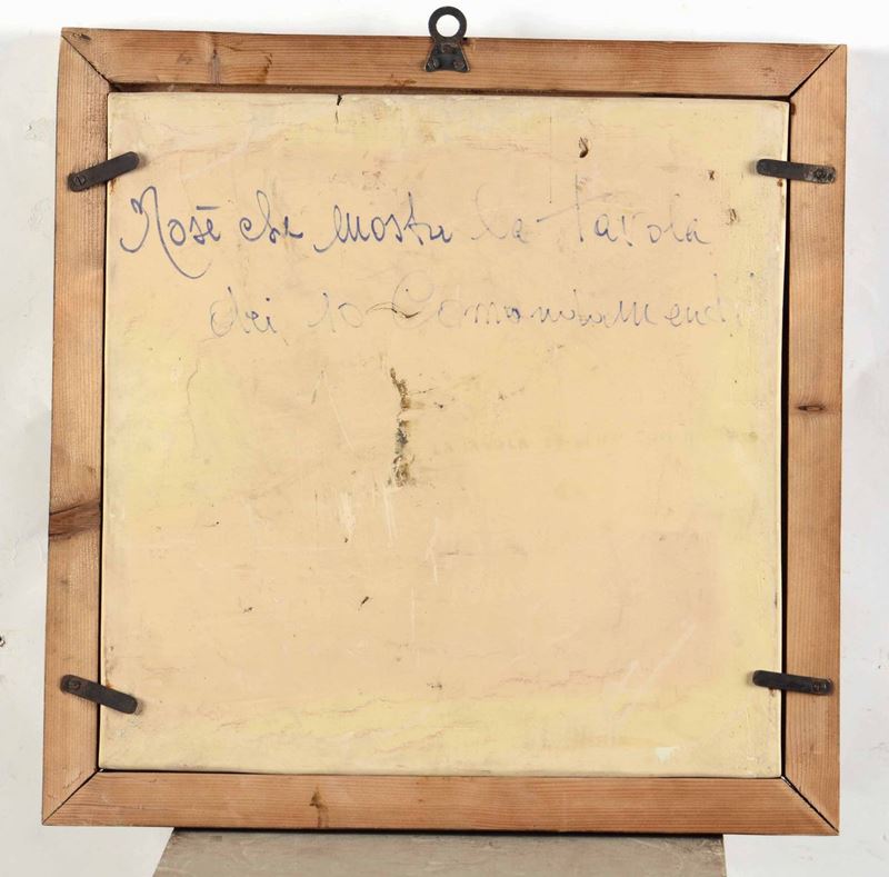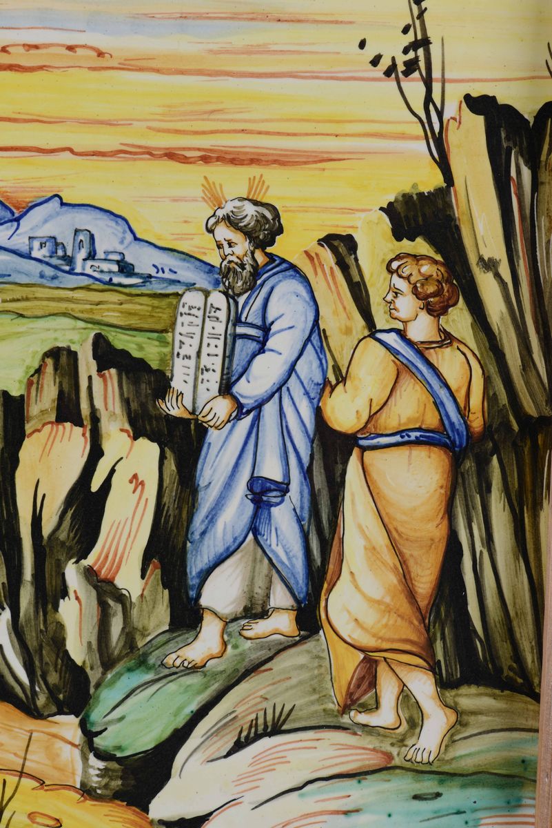 La targa è decorata a istoriato alla maniera di Urbino con Mosè che mostra la tavola