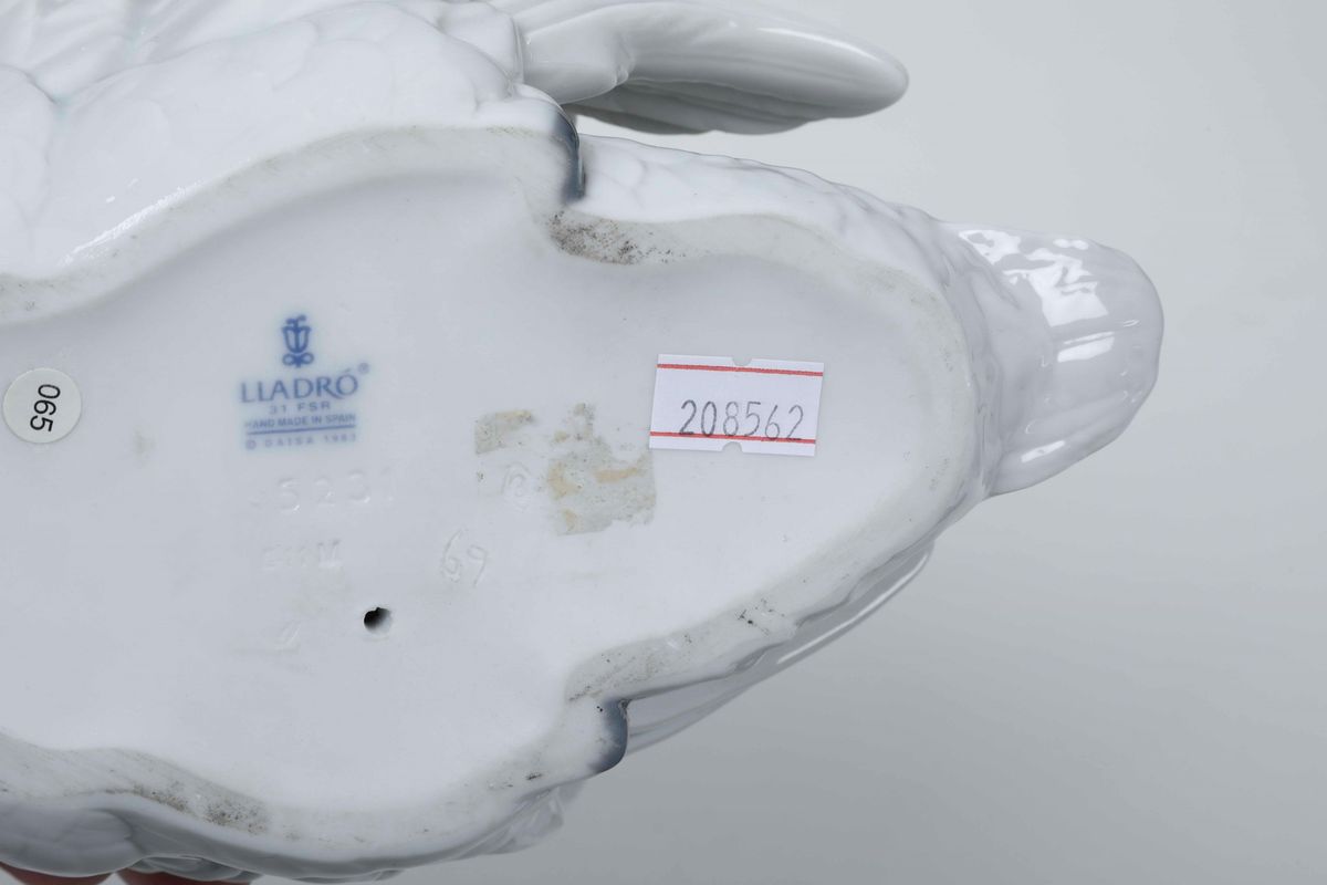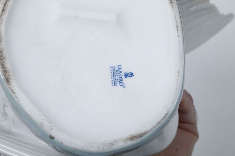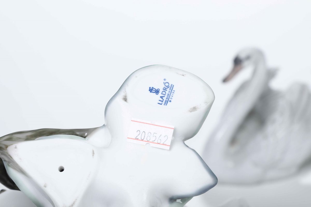 Porcellana policroma. Marca: simbolo grafico della fabbrica, “Lladró Hand made in Spain © Caisa; inoltre le date “1995” e “1983”, in blu. Dimensioni: tortora h. cm 29; gruppo con tortore h. cm 24,5; cigno h. cm 18. Tortora con un’ala rincollata e parte del becco mancante