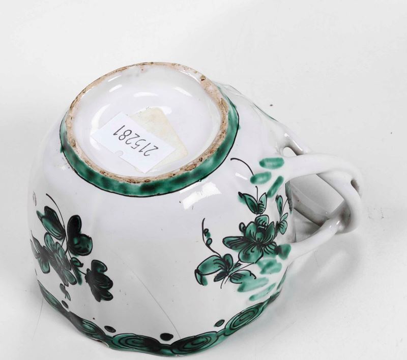 Maiolica. Marca: assente. Altezza tazza cm 5,7; diametro piattino cm 12,8. Conservazione: insignificanti sbeccature e felatura al bordo superiore della tazza
