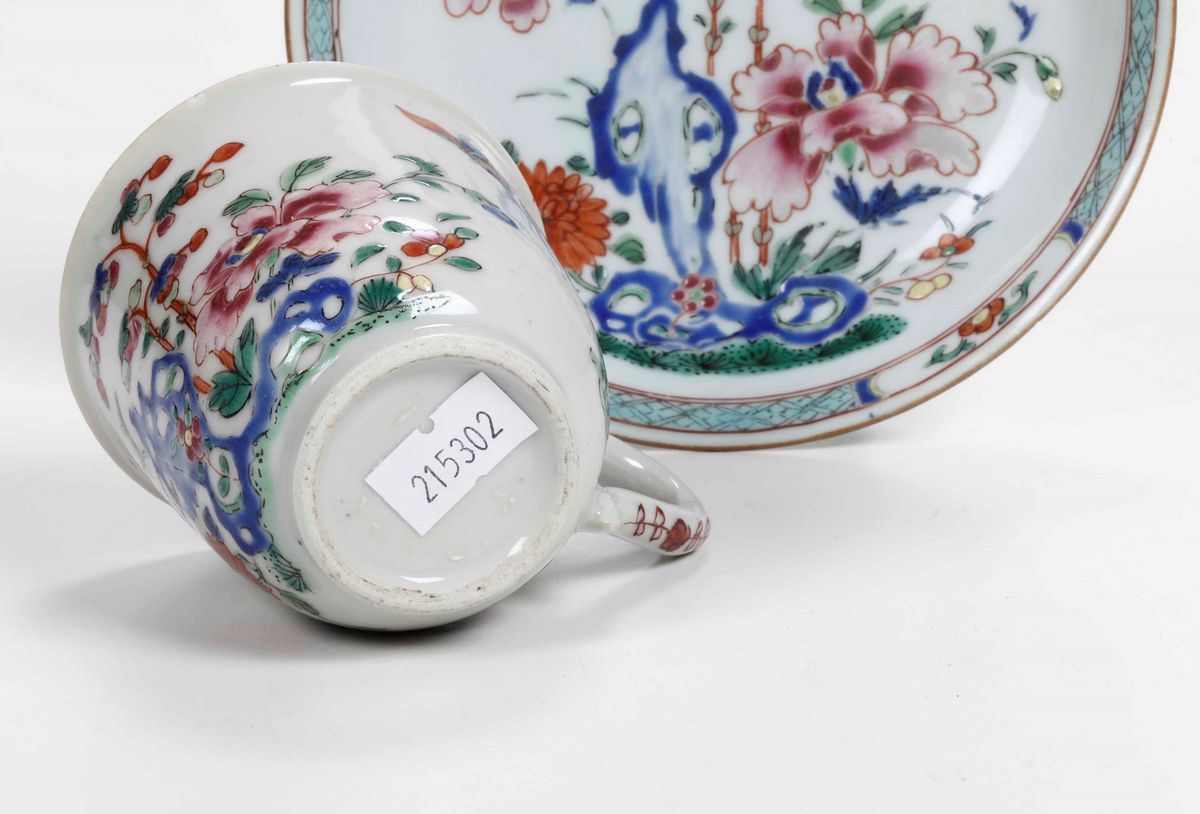 Porcellana. Marca: assente. Altezza tazza cm 7,2 circa; diametro piattino cm 13,8. Conservazione: ottima