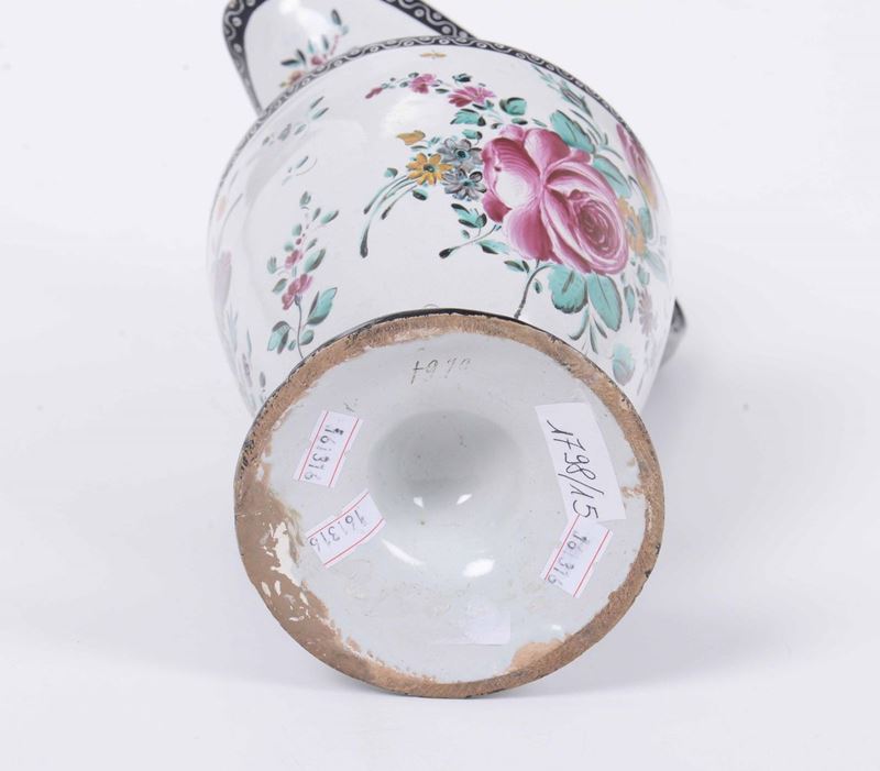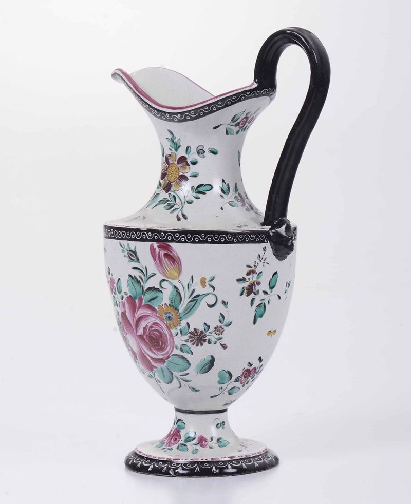 L’elegante versatoio dall’ampio manico ad orecchio, che nasce da un mascherone a rilievo, è dipinto con un grande mazzo di fiori vari con rosa purpurea al centro e ramoscelli fioriti e fogliati sparsi. Inoltre profilature graffite su fondo manganese