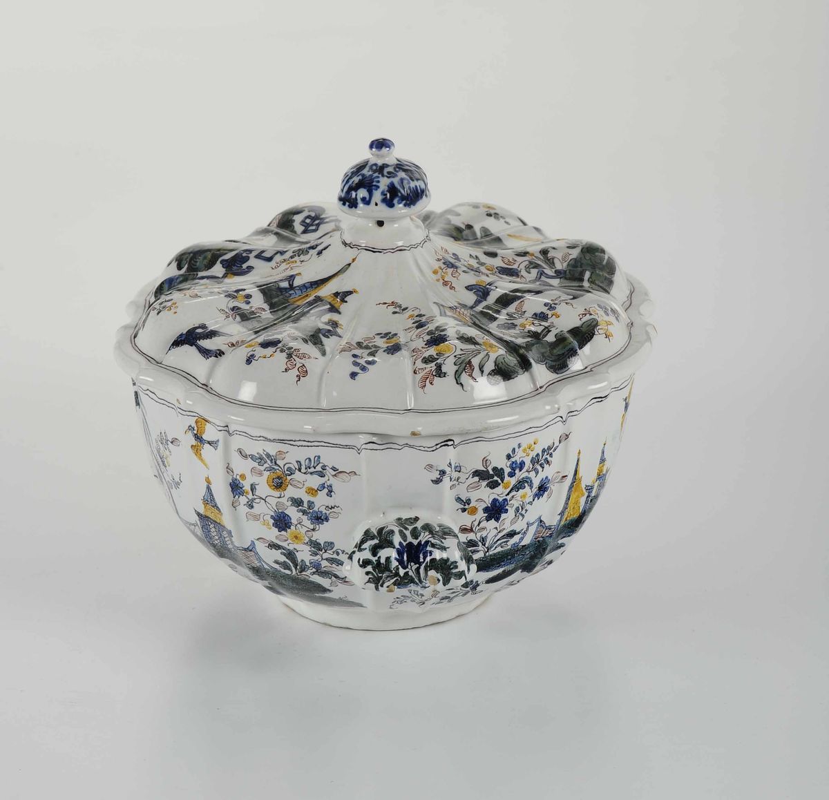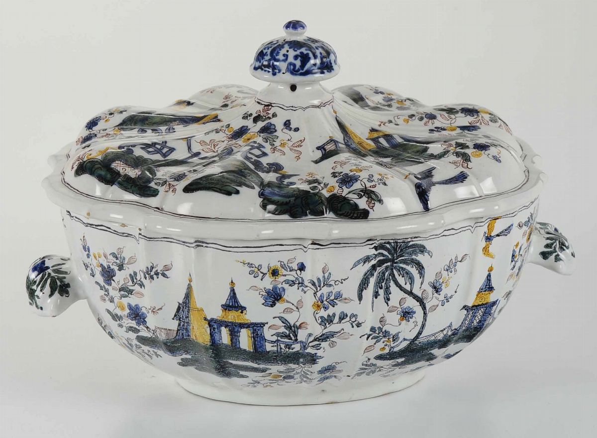 Dalla caratteristica forma ovale ha le pareti costolate, anse a conchiglia e coperchio con presa a pomello. La decorazione ospita il caratteristico motivo “a ponticello” con architetture d’ispirazione cinese, piramidi e pagode attorniate da grandi tralci fogliati e fioriti, palme e pavoni in volo. Doppio filetto in blu lungo i bordi