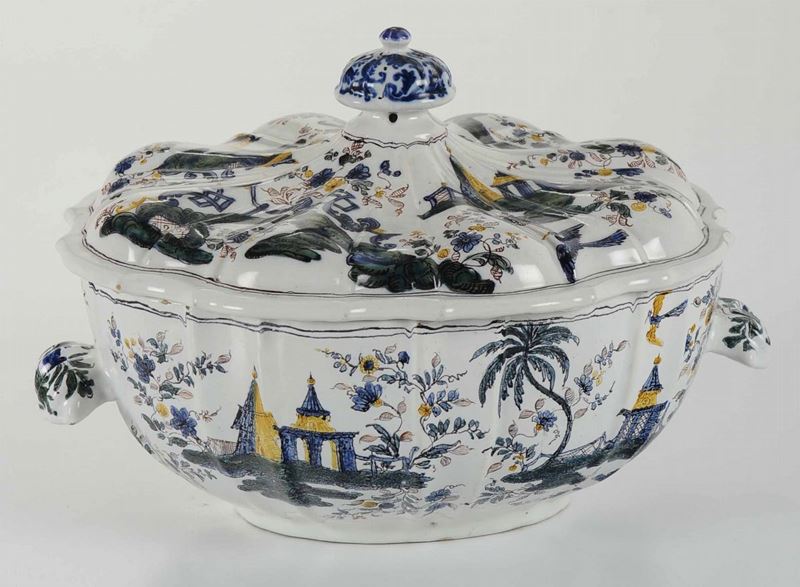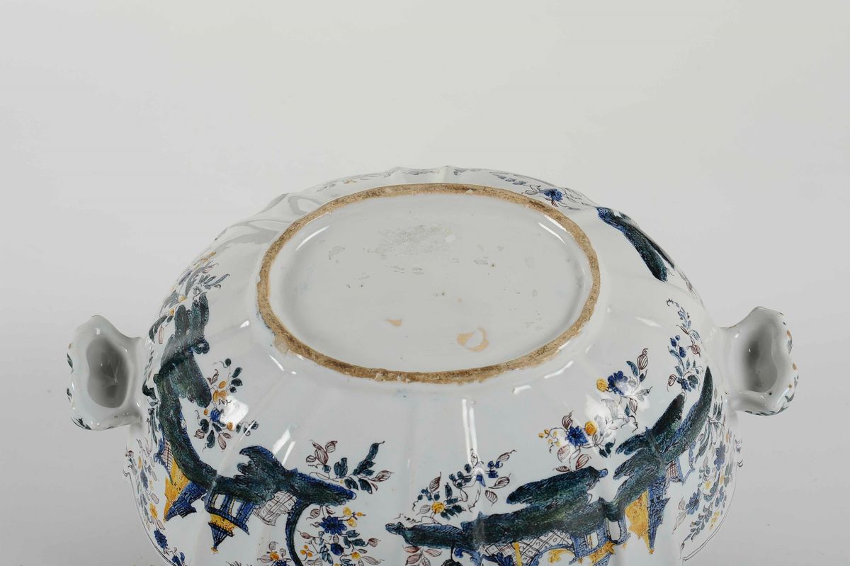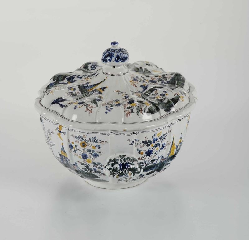 Maiolica policroma a gran fuoco. Altezza cm 21; 30x24. Conservazione: minime felature e sbeccature restaurate al bordo superiore. Qualche discrepanza di stile tra zuppiera e coperchio