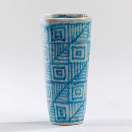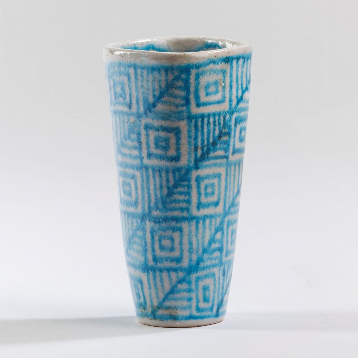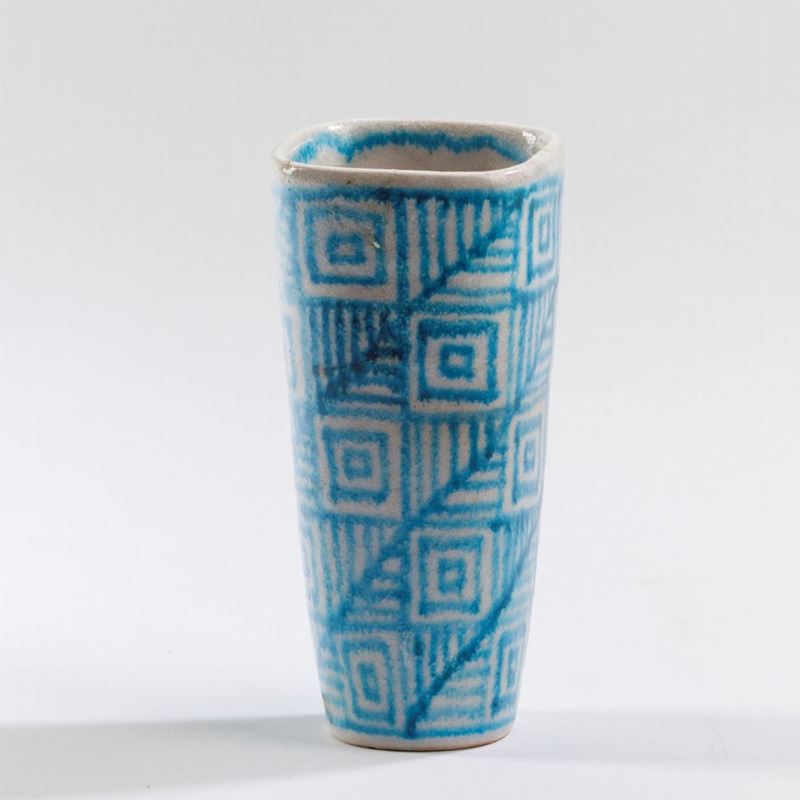 Piccolo vaso a sezione quadrata in terracotta maiolicata con decoro di smalto al sale a disegno astratto.
