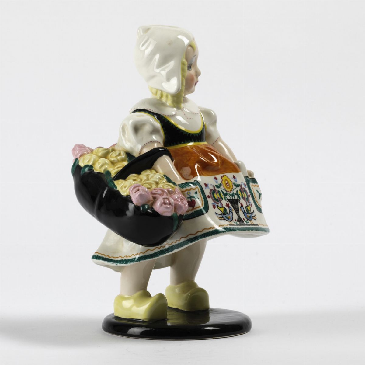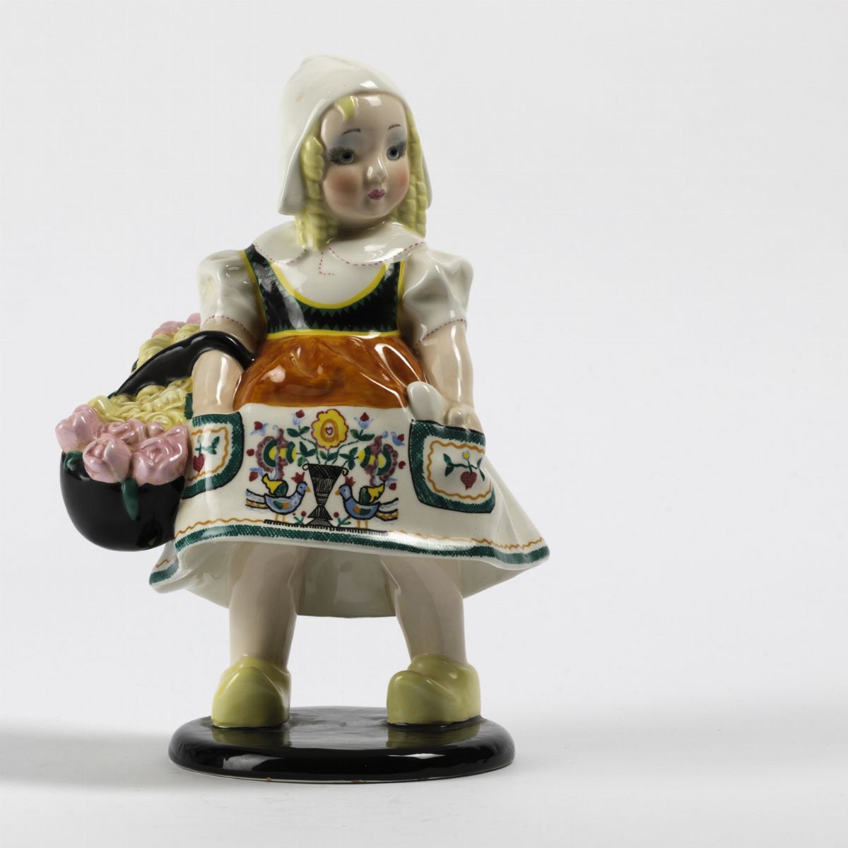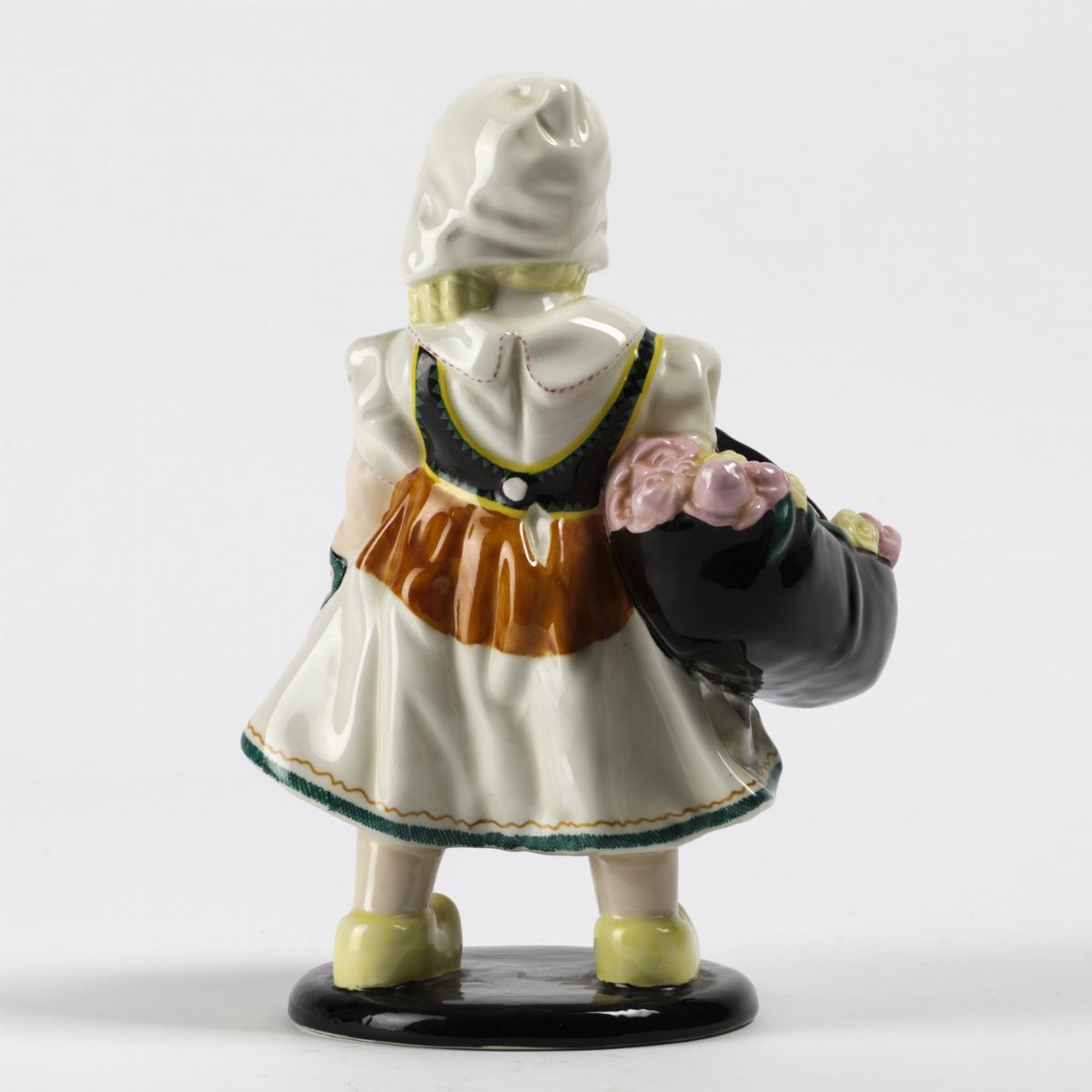 Figura in terraglia a colaggio con decoro policromo.