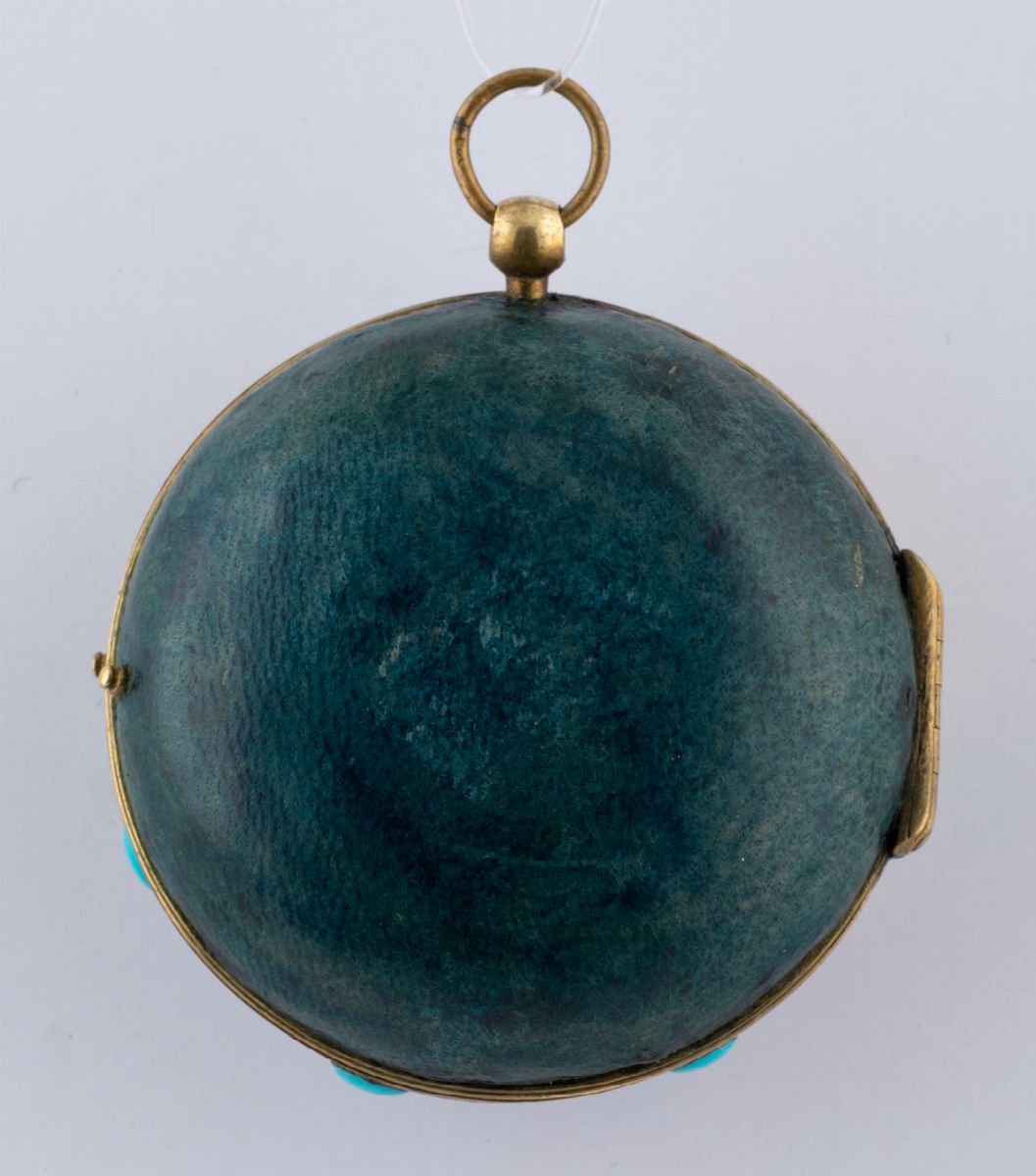 CASSA:in ottone e rivestimento in pellame recente e 7 tondi di pasta di turchese.