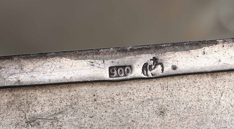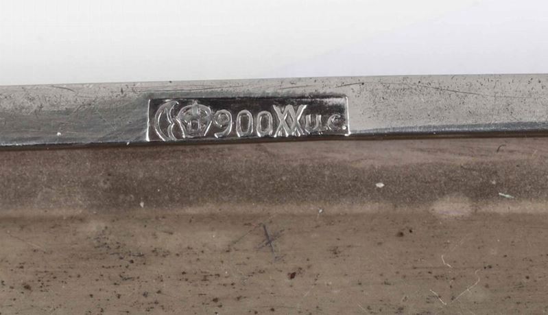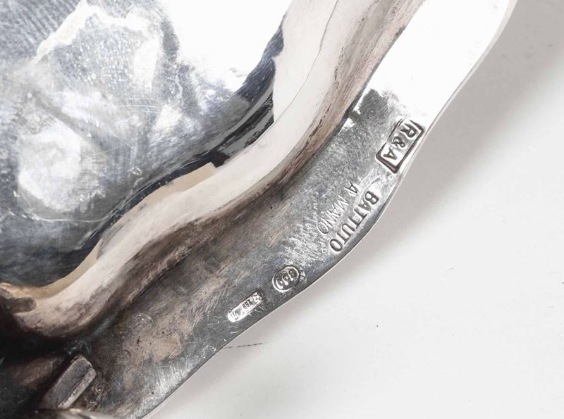 bugia su modelli dell’argenteria veneta del XVIII secolo, cm 26x14x5,5, portasigarette cm 12x8 e cm 7x9 gr 452