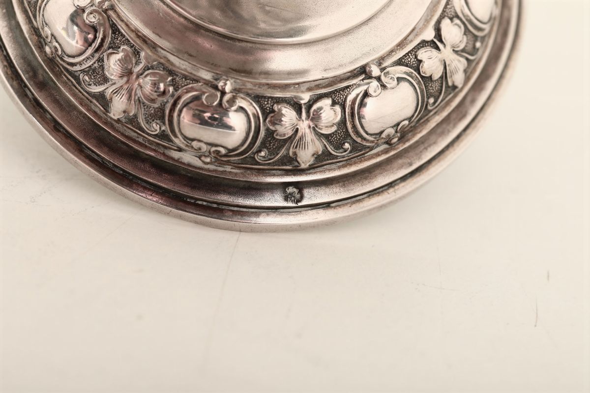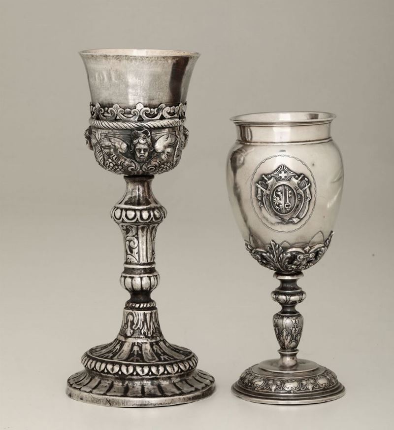 Calice in argento fuso e cesellato con decori a rastremature, fogliette e teste di cherubini, Italia XIX secolo (bollo co [..]