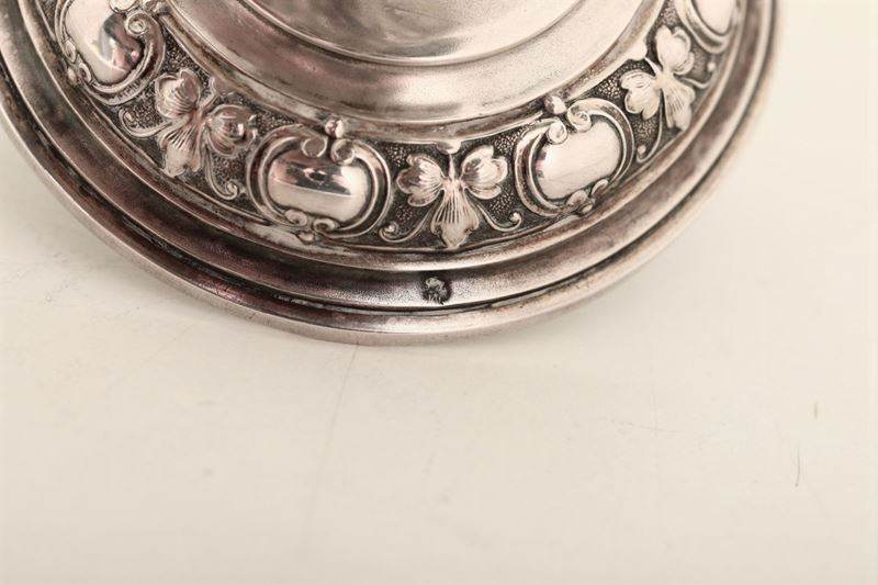 del lotto fa parte anche una coppa in argento fuso e traforato con decori a riserve, volute e floreali. Francia (?) XIX-XX secolo;