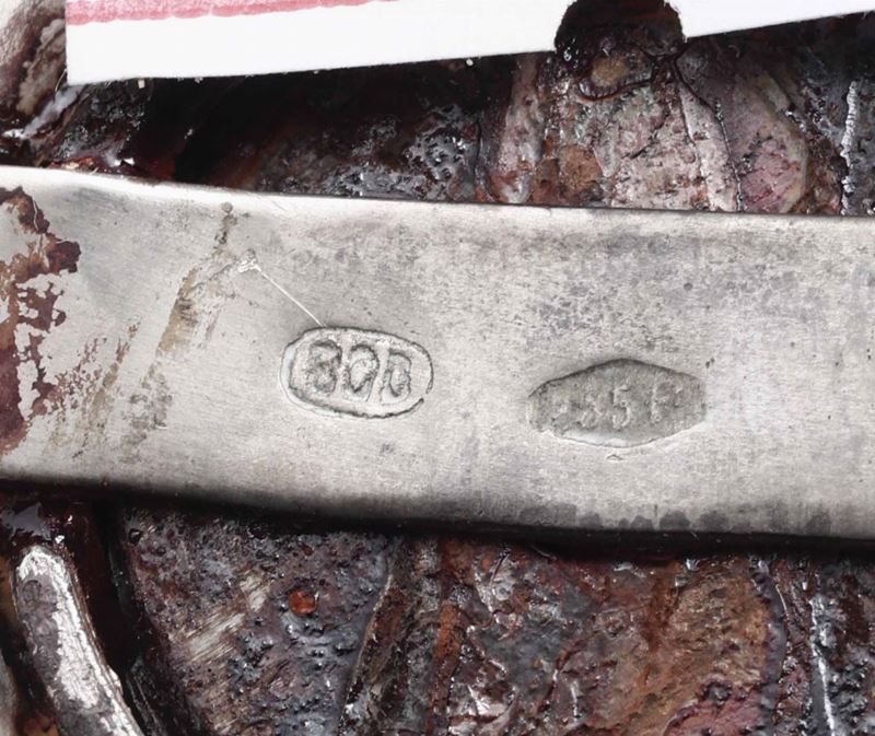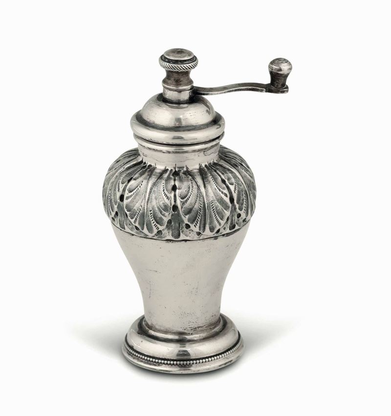 Macinapepe in argento e parti in metallo. Argenteria italiana del XX secolo