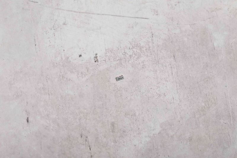 Elegante bordo sagomato e decorato con motivi di gusto barocco. Al centro monogramma cesellato SGC