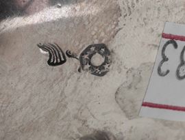 Gr. 134, altezza cm. 11. Corpo cilindrico con fascia decorata a traforo, poggiante su tre piedini a foggia di tritoni e presa a forma di cane.