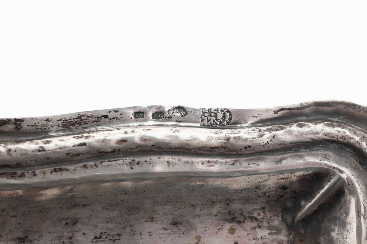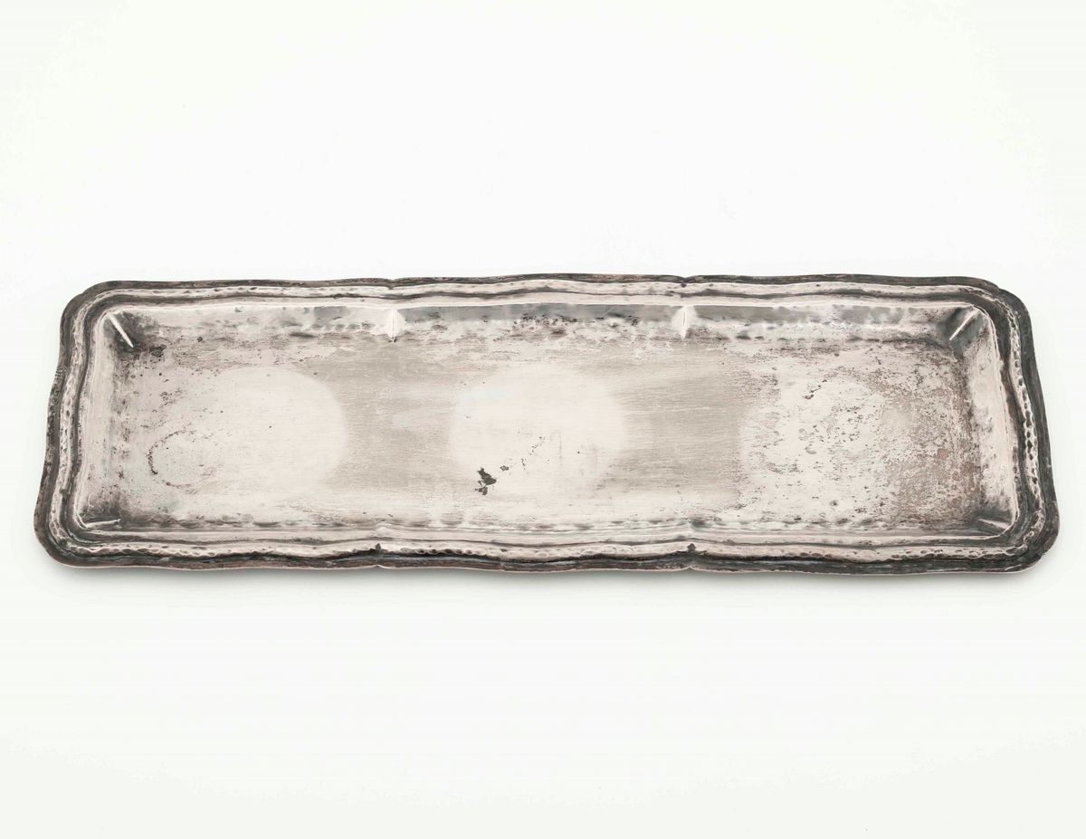 Vassoietto rettangolare in argento sbalzato. Argenteria artistica italiana del XX secolo