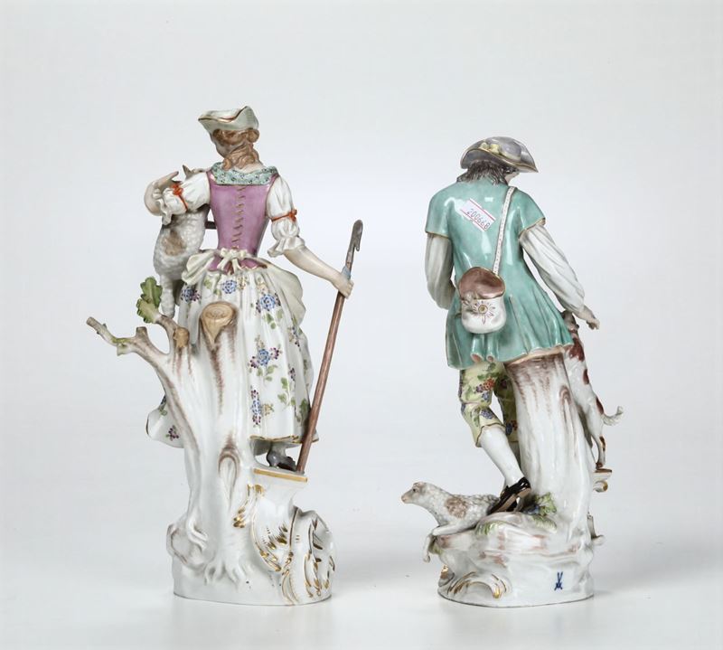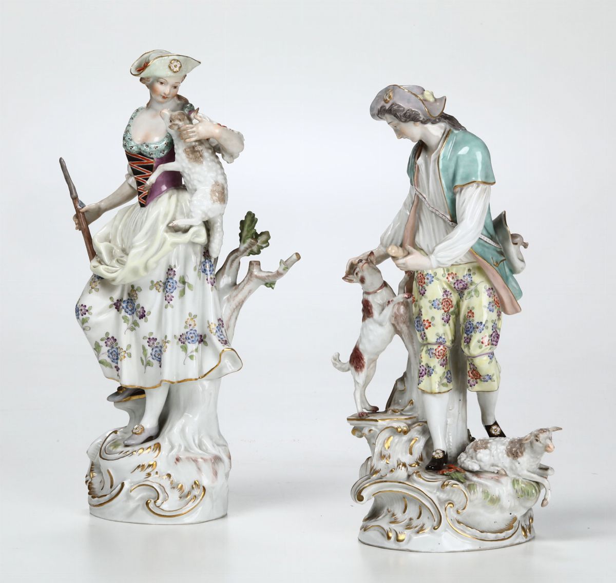Porcellana. Marca: spade in blu. Altezza: cm 30 e rispettivamente cm 28. Ottimo stato; parte superiore del bastone della pastorella rincollato