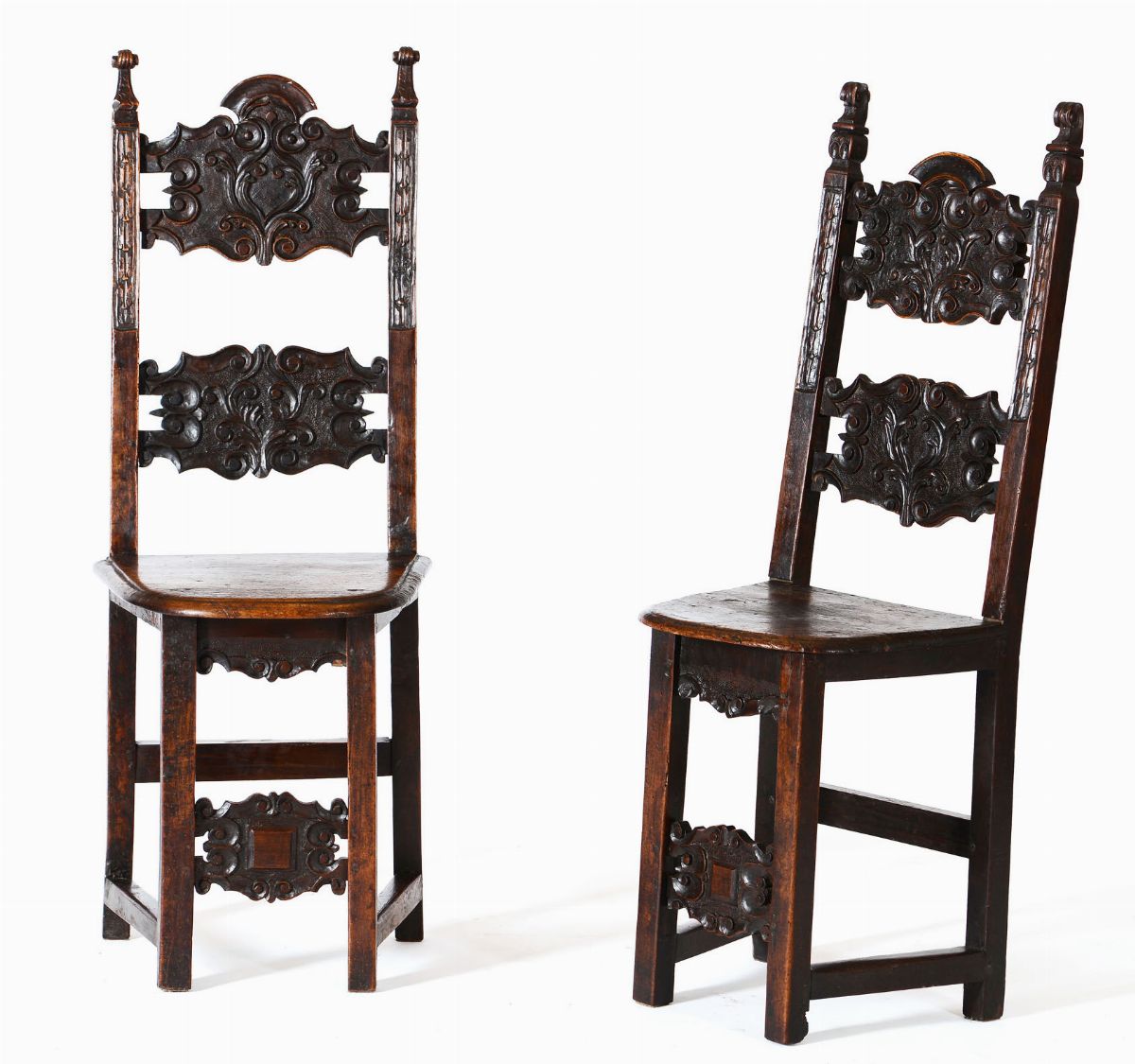 Coppia di sedie in legno intagliato, XVII-XVIII secolo