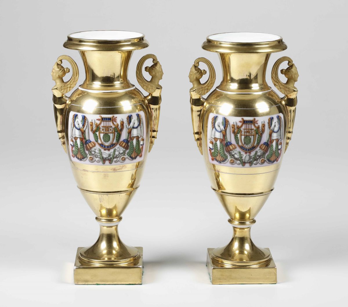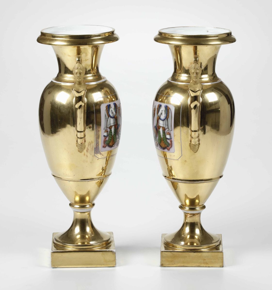 I vasi biansati hanno le prese a foggia di protome alata. Sul recto ospitano una riserva policroma con elementi decorativi di gusto Impero. Il resto della superficie è dorato