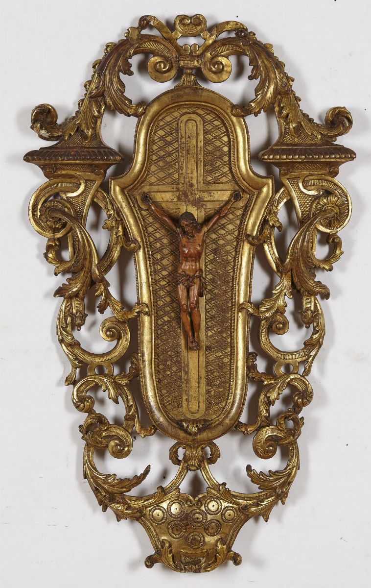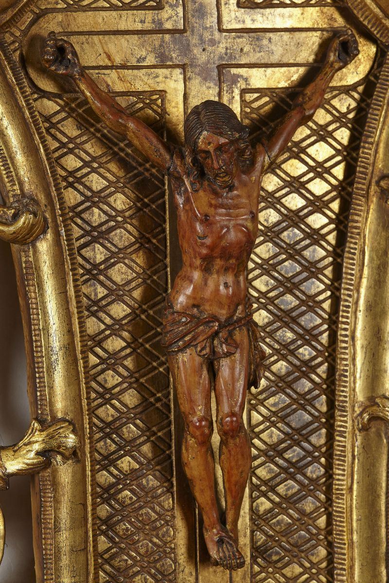 Corpus Christi in legno entro ricca cornice intagliata e dorata, XVIII secolo