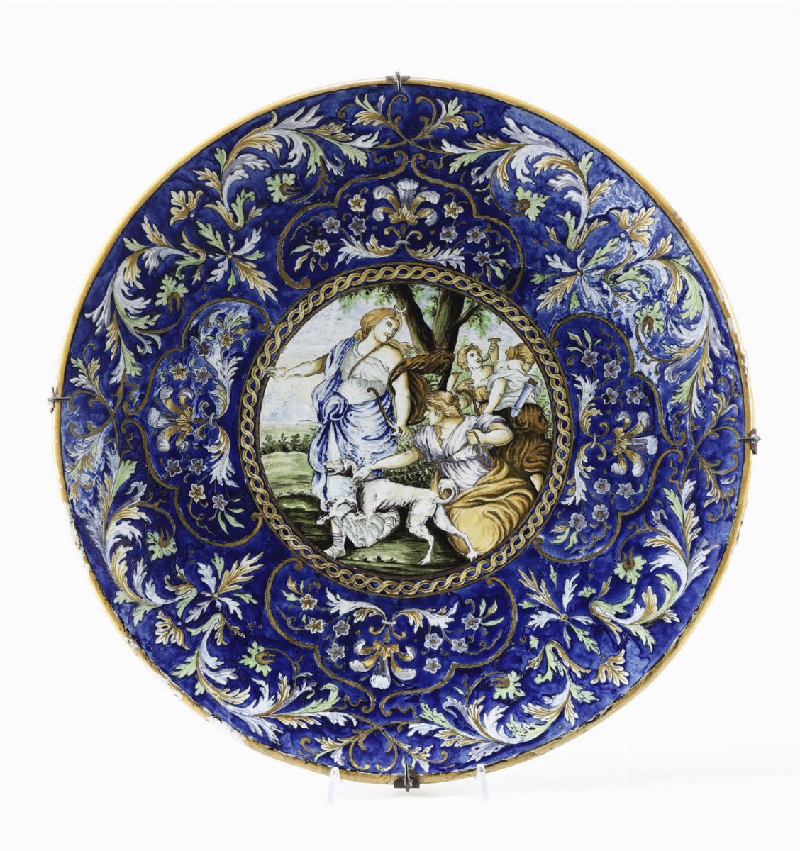Il piatto istoriato raffigura, nel cavetto, Diana, la dea della caccia, con diversi personaggi. L’ampia tesa è dipinta a rami fogliati su fondo blu