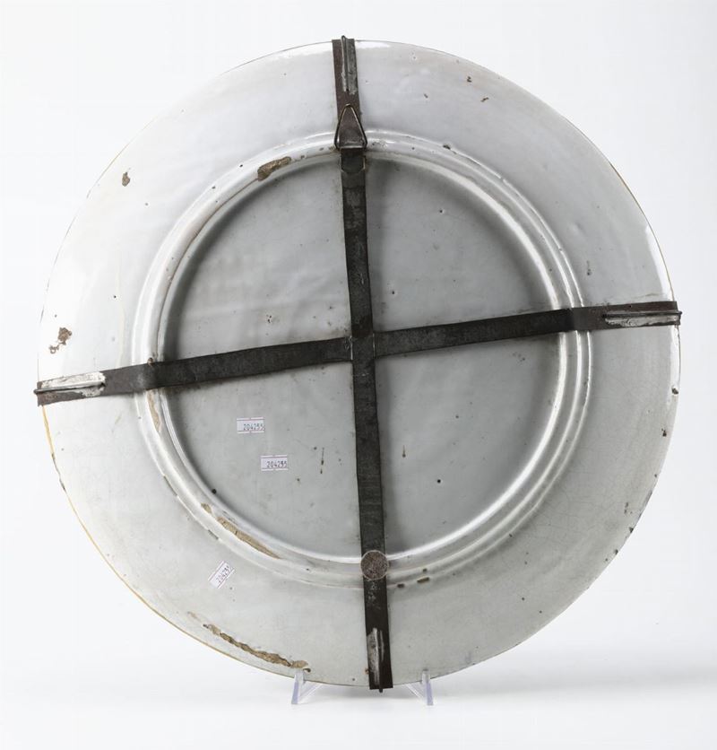 Maiolica policroma. Marca: assente. Diametro cm 52,5. Buono stato di conservazione, minime sbeccature sul bordo