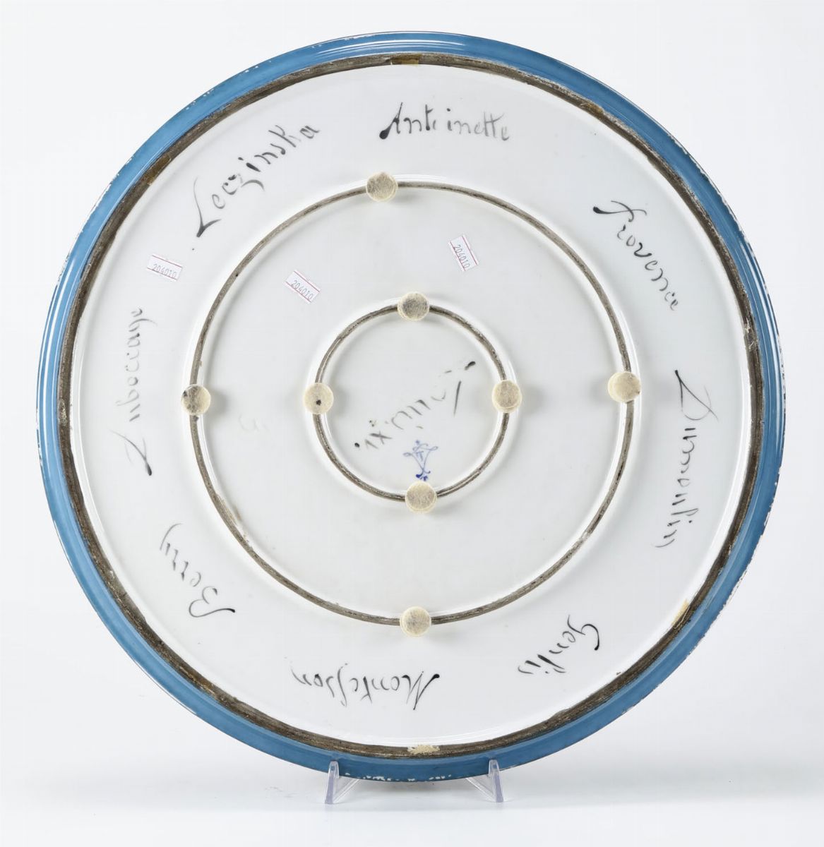 Questo grande vassoio dal fondo celeste, è dipinto con nove medaglioni che racchiudono ritratti. Al centro troviamo Luigi XV e tutt’intorno nobili dame della corte. I vari personaggi sono identificati sul verso con i nomi tracciati in nero