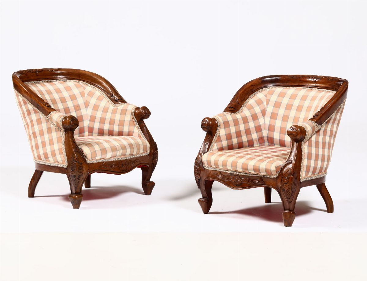 Modellini di coppia poltrone in legno di noce intagliato, XIX secolo