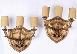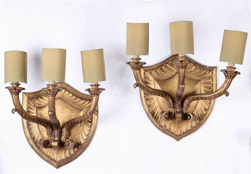 Quattro appliques a tre fiamme in legno dorato