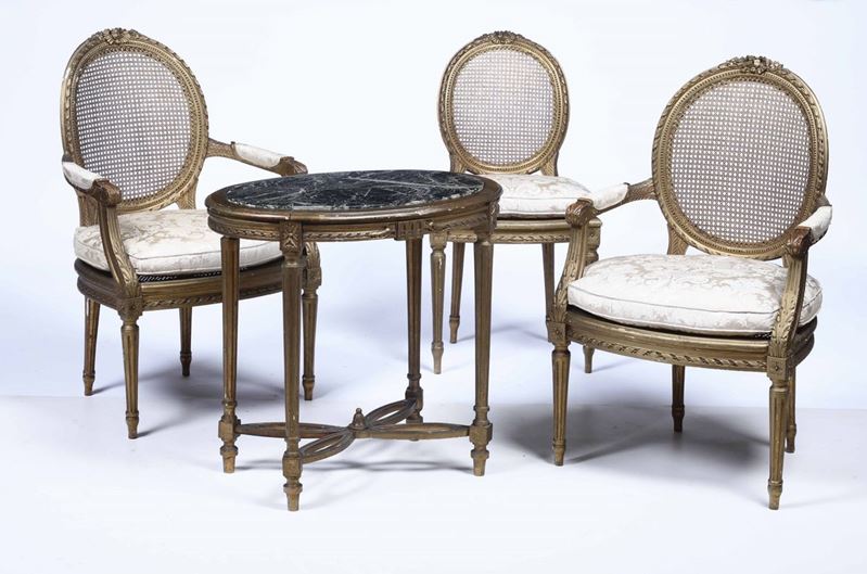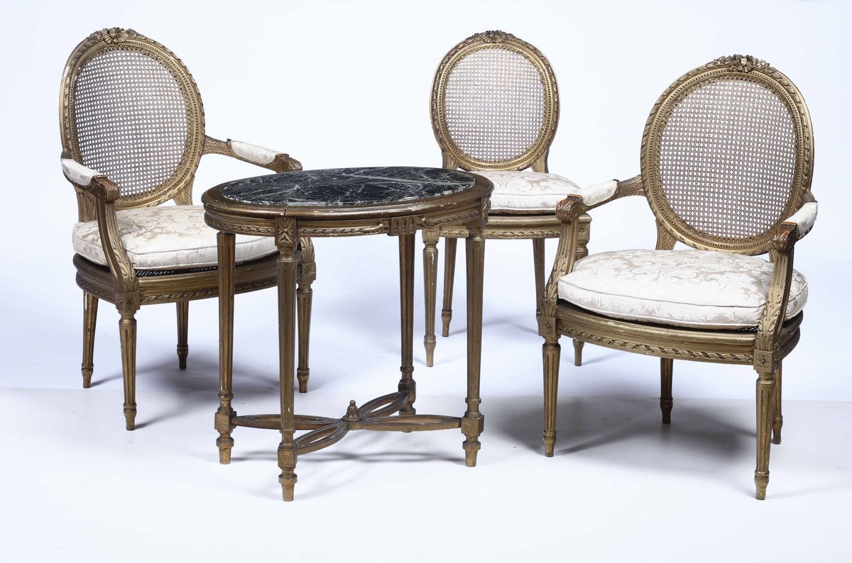 composto da divano, coppia di poltrone, sedia e tavolino con piano in marmo