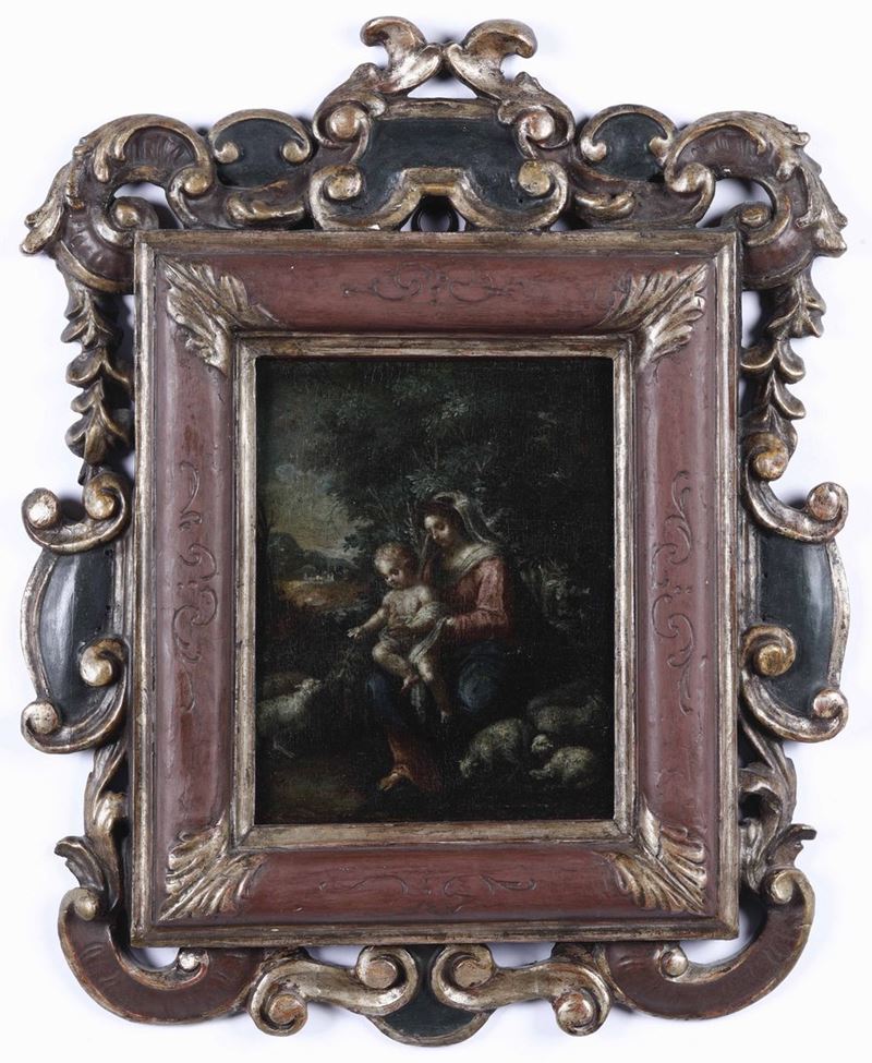 Scuola ferrarese dell'inizio del XVII secolo Madonna con Bambino entro paesaggio