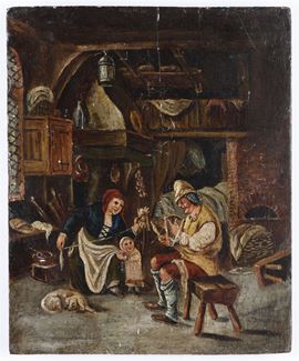 Scuola fiamminga del XVIII secolo Scena domestica di interno con personaggi che filano