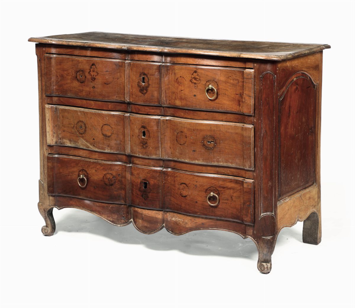 fronte mosso a tre cassetti, piedi a ricciolo, cm 130x60x95
