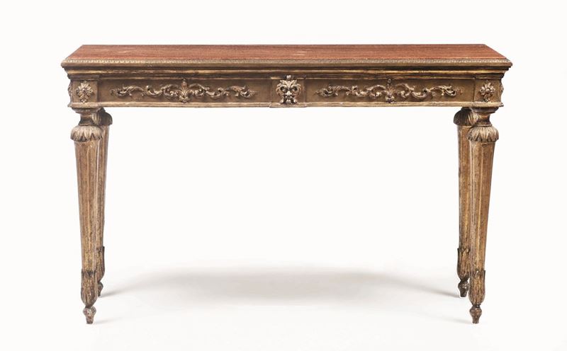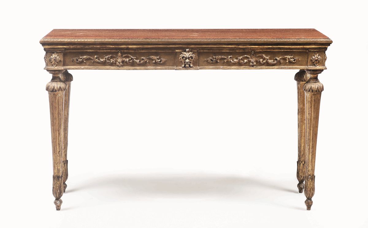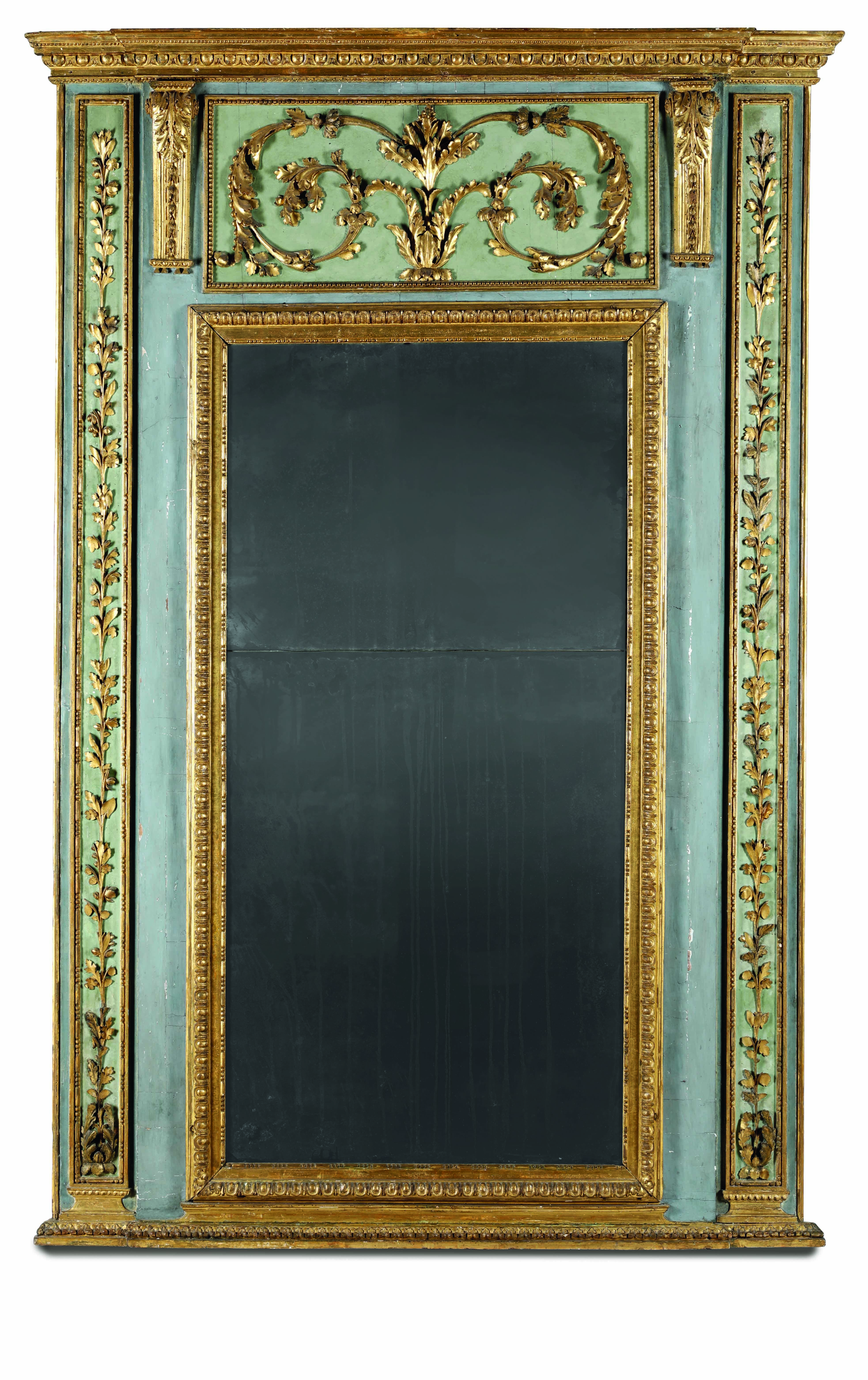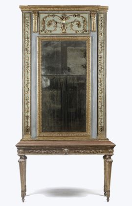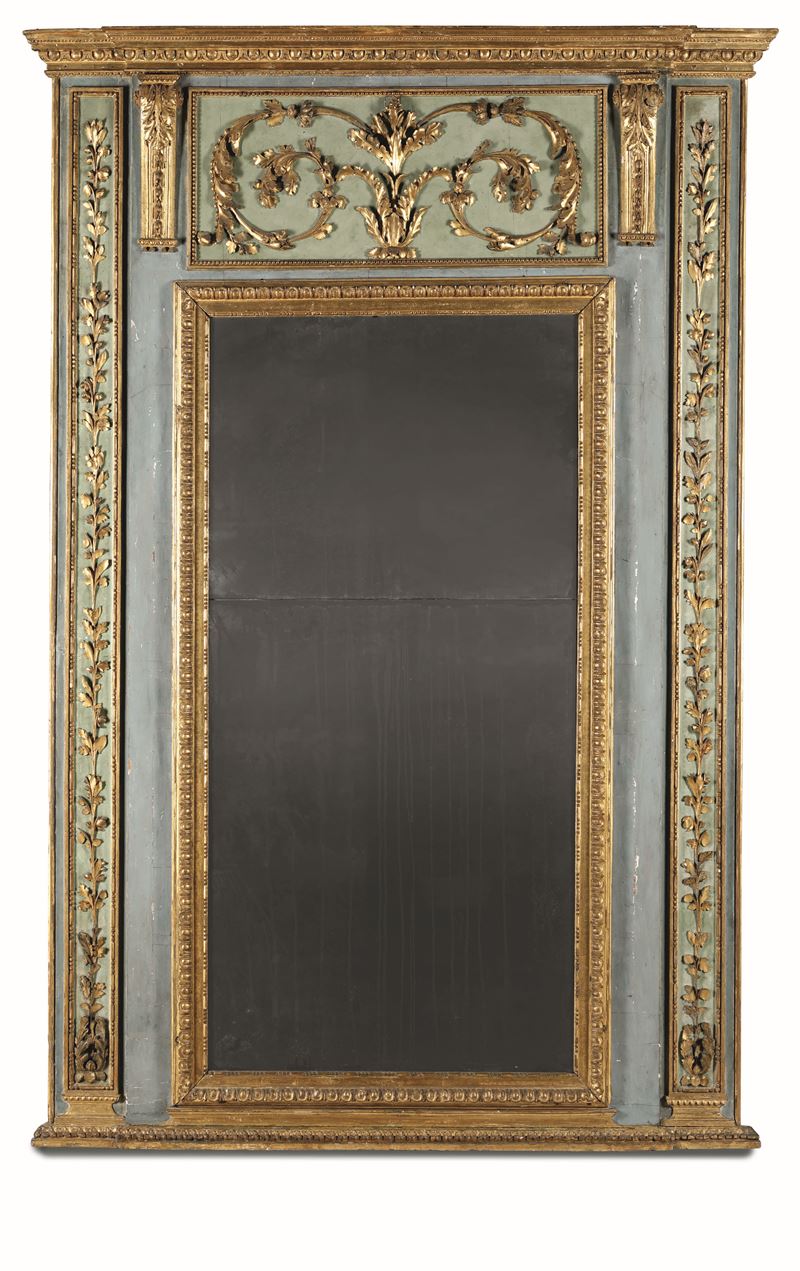 Consolle Luigi XVI in legno intagliato, dorato e dipinto, con specchiera non pertinente ma antica, XVIII secolo