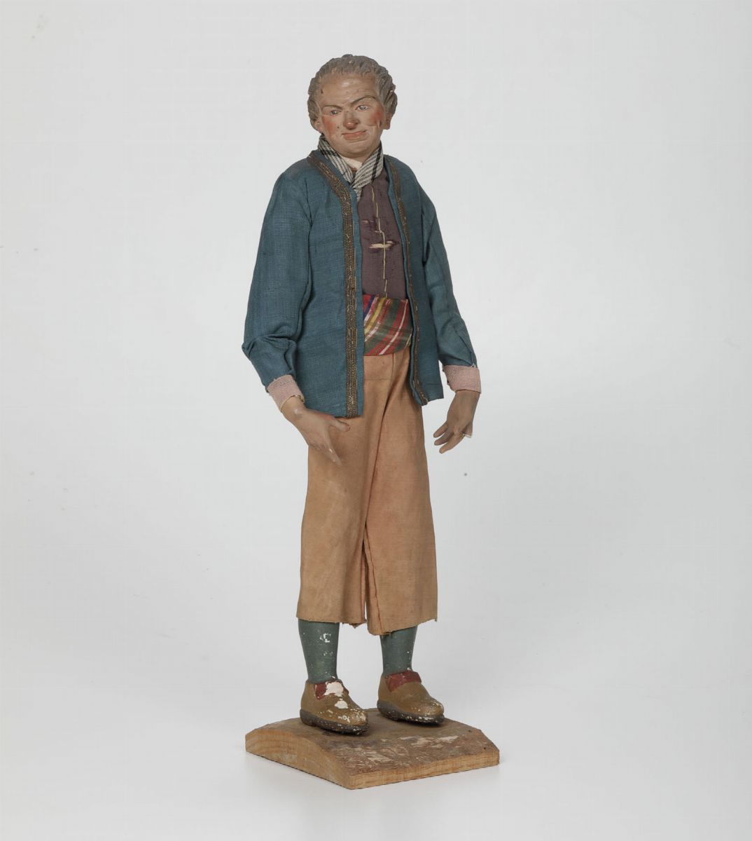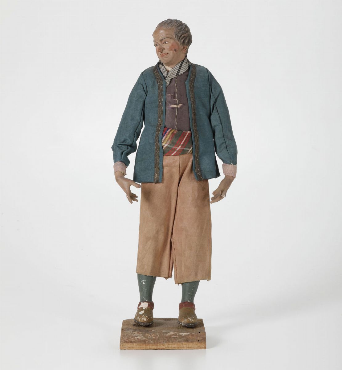 Testa in terracotta policroma, occhi di vetro, arti in legno intagliato e policromo, vesti in stoffa.